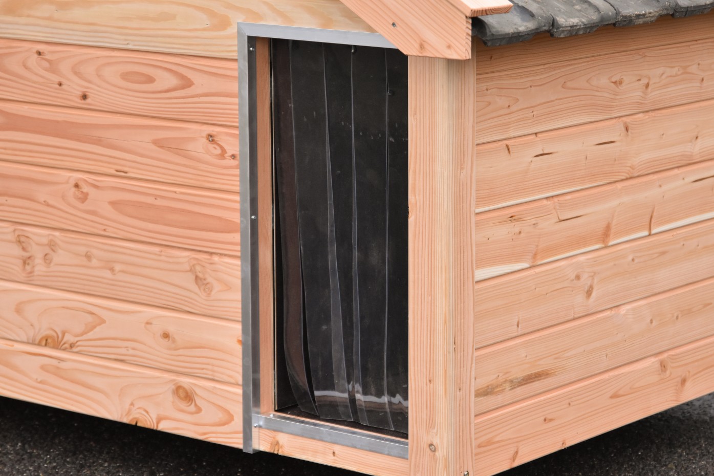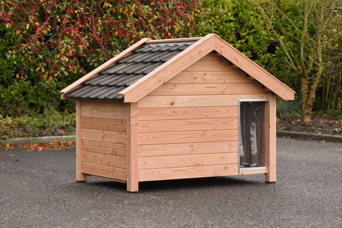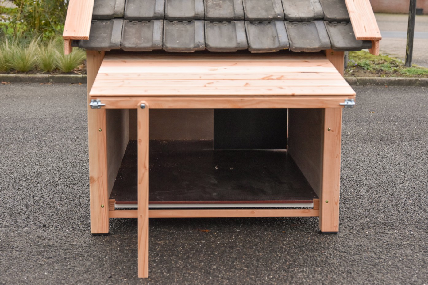 Buda Turbo Douglas Iso to bardzo duża, ocieplona buda w czerni z drewnem daglezji i ścianami o grubości 7 cm dla maksymalnej ochrony. Wykonywana jest ręcznie, ma stylowy i solidny wygląd. Obracana przegroda przeciwwiatrowa oraz całkowicie odchylana ściana boczna ułatwiają czyszczenie. W upalne dni otwarta strona zapewnia lepszą wentylację. Odpowiednia dla dużych ras, takich jak Berneńczyk, Dog Niemiecki czy Boerboel.
