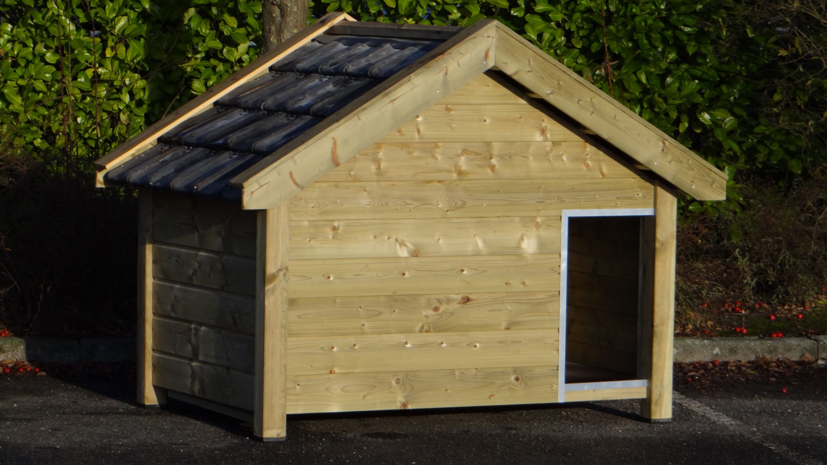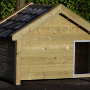 Ocieplona buda Snuf to duża buda dla psa. Buda wykonana jest z impregnowanego drewna świerkowego w połączeniu z płytą betonplex i prawdziwymi dachówkami. Bardzo praktyczna i wygodna! Izolowane ściany mają aż 7 cm grubości. Wymiary zewnętrzne ok.: 193 × 134 × 143 cm (S × G × W). Ocieplona, drewniana buda najwyższej jakości!