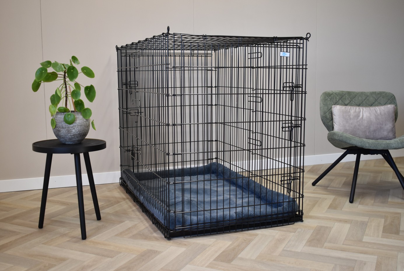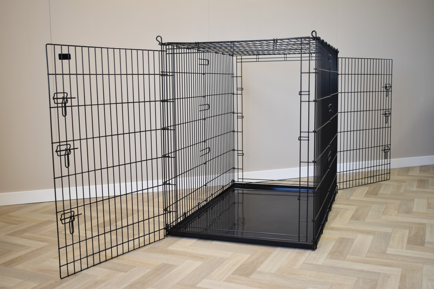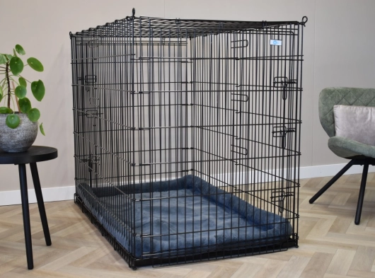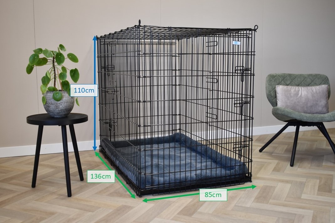 Ta ekstra duża skrzynia dla psa o wymiarach nie mniejszych niż 136x85x110cm to ogromna skrzynia dla psa. W tej drucianej klatce zmieści się nawet największy pies. Ta duża buda dla psa XXL wyposażona jest w 2 drzwi z solidnymi, 3-dwustronnymi zamknięciami.