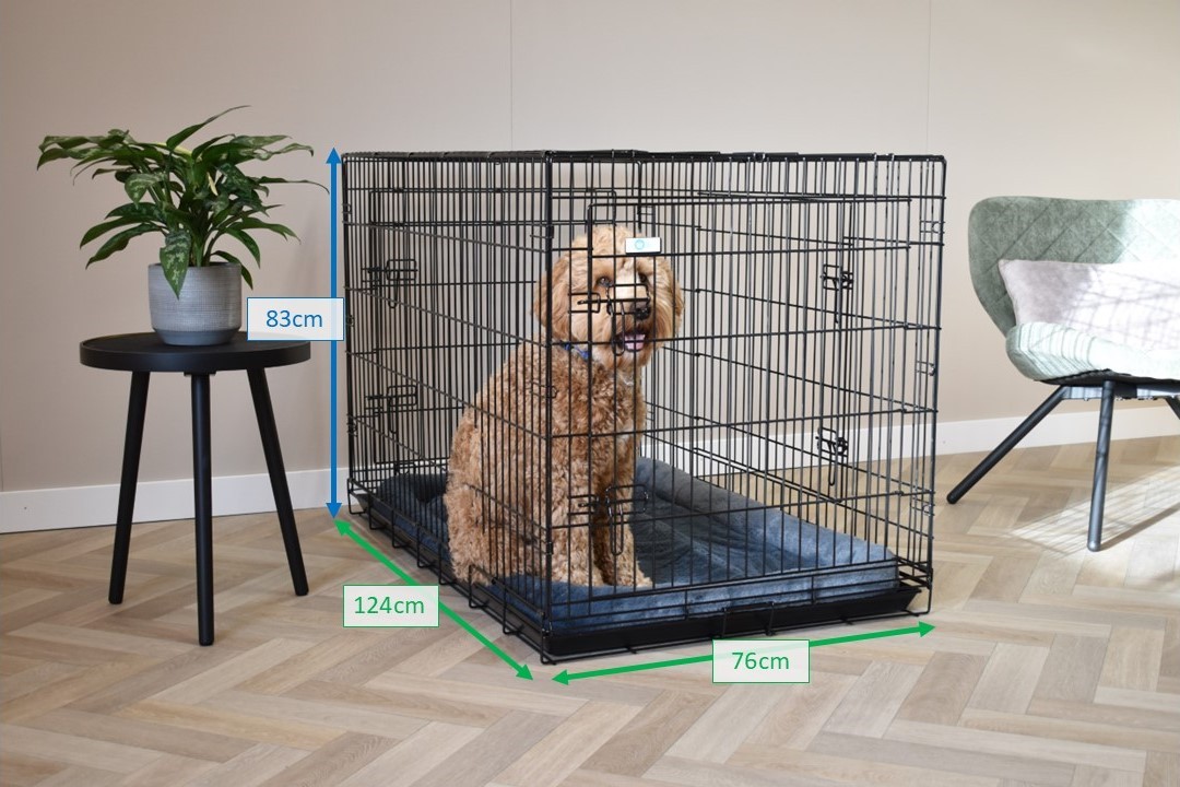 Duża klatka dla psa o wymiarach 124x76cm i wysokości 83cm. Solidna klatka dla psa z grubymi, czarno proszkowo powlekanymi prętami. Klatka ma 3 solidne drzwi z podwójnymi zamknięciami. Ta duża, składana klatka dla psa ma także gumowe nóżki antypoślizgowe i solidną, wyjmowaną plastikową misę. Nasza klatka dla psa nadaje się dla dużych psów, takich jak Alaskan Malamute, Bobtail, Bouvier, Bullmastiff, Doberman Pinscher, Niemiecki Owczarek, Egipski Faraon, Rottweiler, Czechosłowacki Wilczak, Szwajcarski Owczarek i Szwajcarski Pies Górski. Klatka dostępna w 7 różnych rozmiarach: 48cm / 63cm / 78cm / 93cm / 109cm / [124cm] / 136cm.