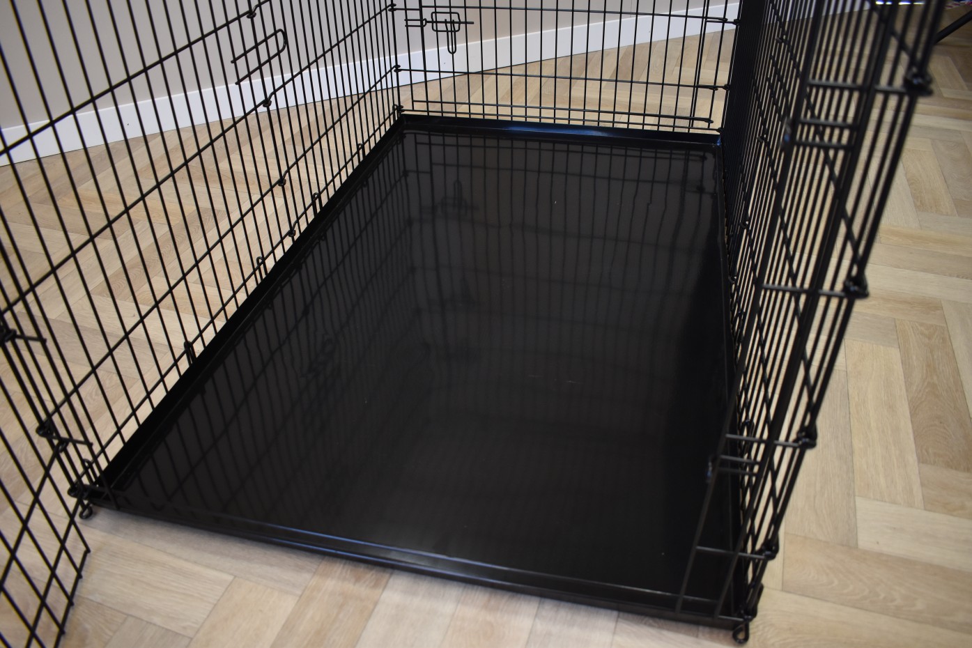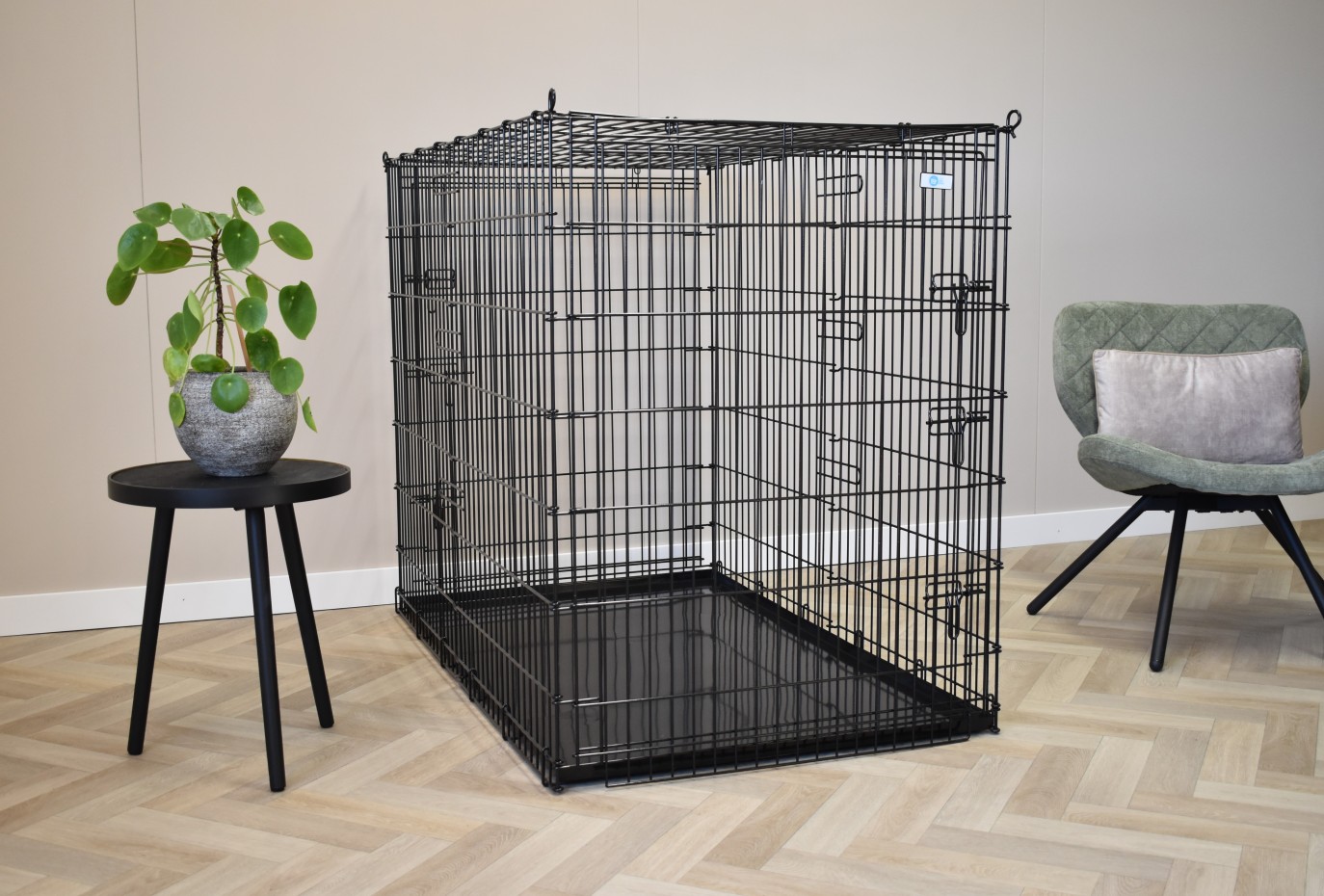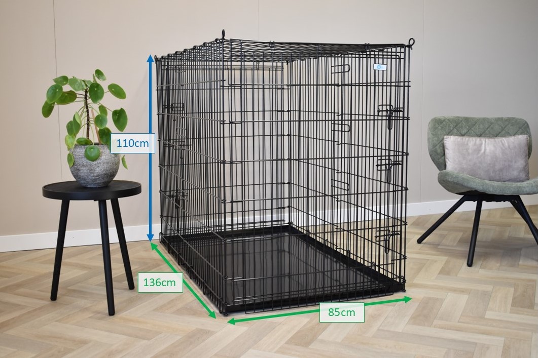 Ta ekstra duża skrzynia dla psa o wymiarach nie mniejszych niż 136x85x110cm to ogromna skrzynia dla psa. W tej drucianej klatce zmieści się nawet największy pies. Ta duża buda dla psa XXL wyposażona jest w 2 drzwi z solidnymi, 3-dwustronnymi zamknięciami.