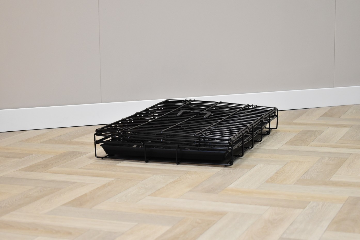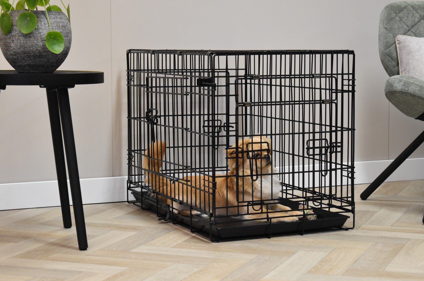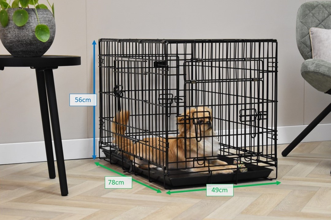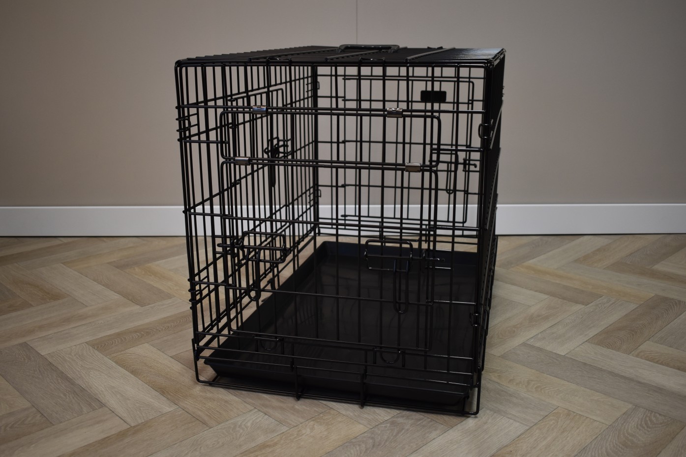 Solidna ławka dla psa o wymiarach 78x49cm. Nasza buda dla psa z solidnymi, grubymi, czarnymi prętami malowanymi proszkowo posiada 3 solidne drzwi z przesuwnym/składanym zamknięciem. Ta poręczna, składana buda dla psa wyposażona jest również w gumowe, antypoślizgowe nóżki. Buda dla psa posiada również wyjmowaną plastikową kuwetę. Ta klatka jest przeznaczona dla nieco mniejszych ras psów: Beagle, Mniejszy Schnauzer, Buldog francuski, Pomsky, Welsh Springer Spaniel i Whippet.