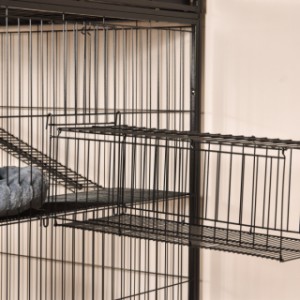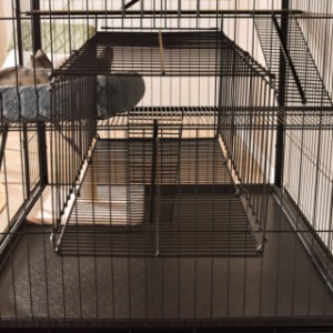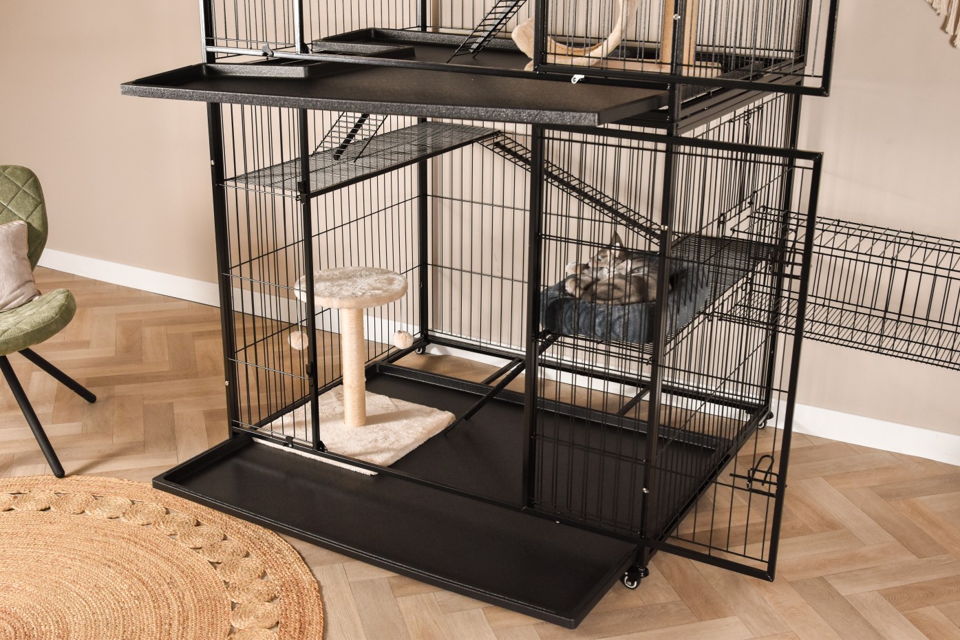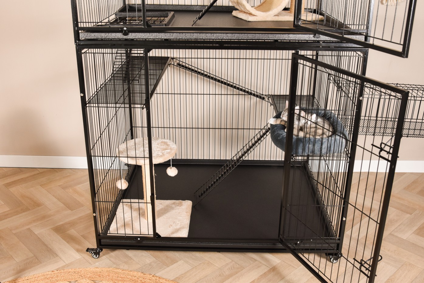 Kattenkooi Nivo is een grote kooi voor uw kat of kittens, geschikt voor binnen gebruik, of onder de veranda. De kattenkooi is voorzien van 2 verdiepingen die met elkaar verbonden zijn door plateautjes en loopplanken. De opening tussen de twee verdiepingen is afsluitbaar. Hierdoor zijn de beide verdiepingen afzonderlijk van elkaar te gebruiken.