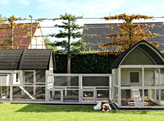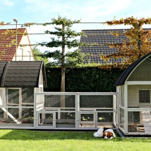 Nasz niesamowity ogromny wybieg XXL, składający się z 2 klatek Kathedraal XXL i 2 wybiegów z fundacją Kathedraal, oferuje miejsce dla królików i kur. Wykonany z pięknego drewna sosnowego z dachem z papy, praktycznym strychem, schodami między piętrami oraz cynkowana metalowa szuflada ułatwiającą czyszczenie. Legowisko nocne można zamknąć na podwójne zamki.