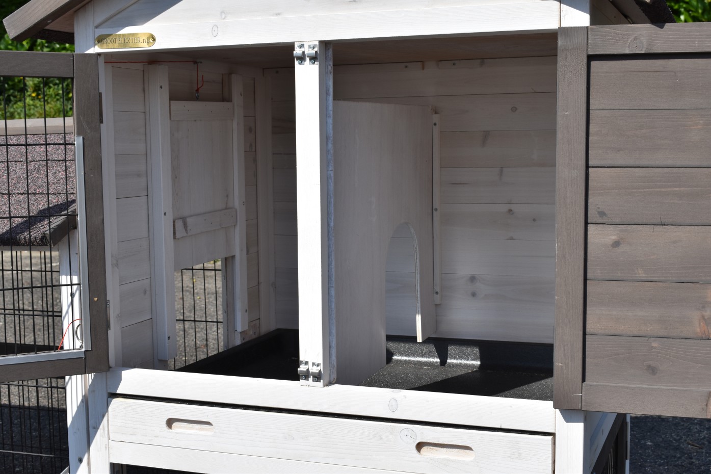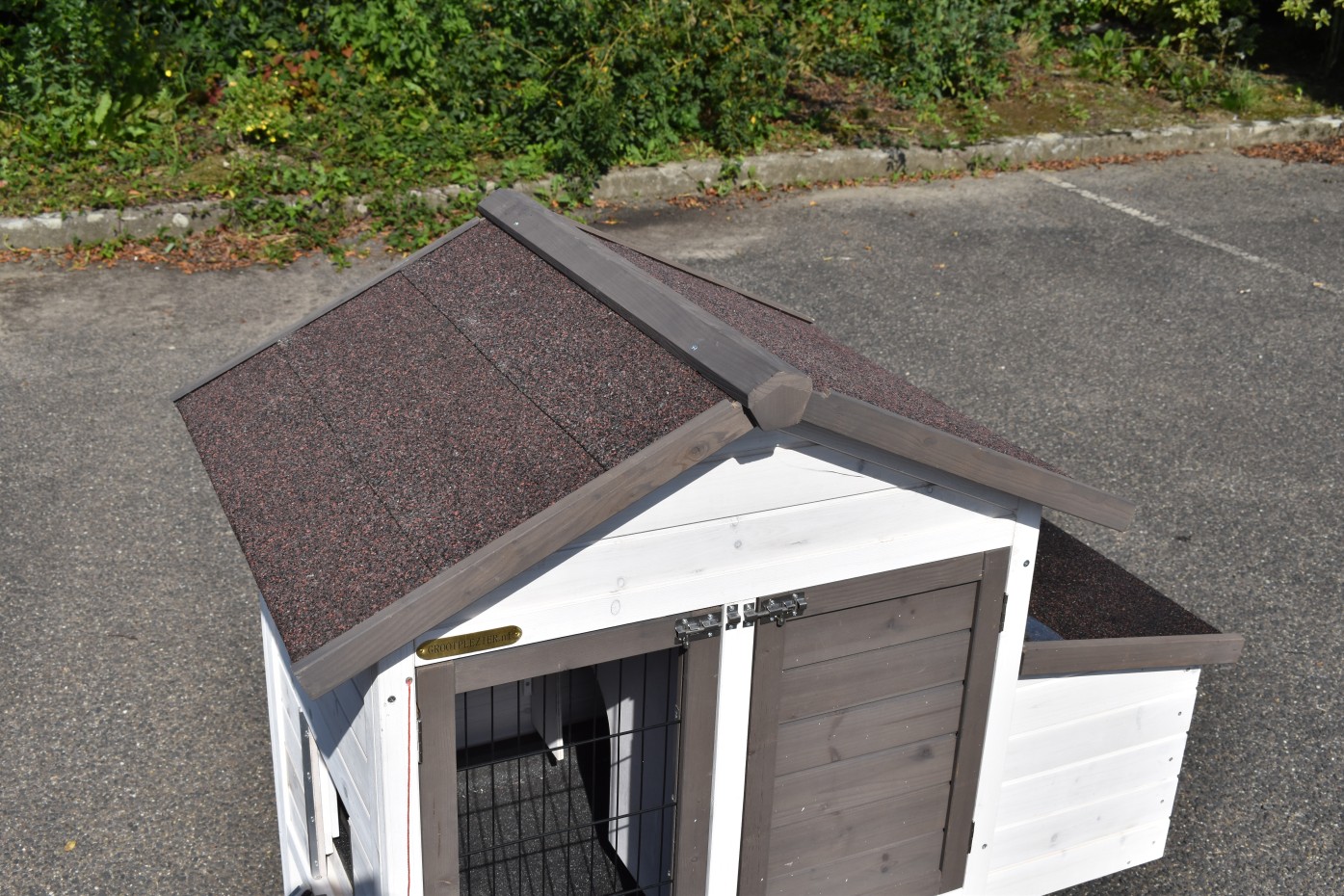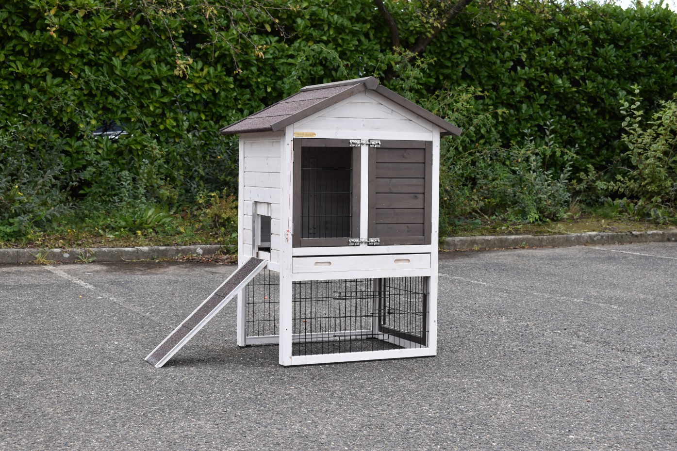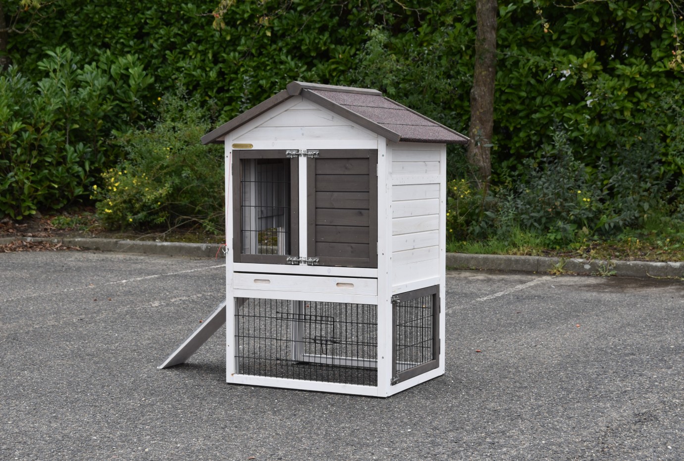 Rabbit Hutch Prestige Small jest wysuwanym modułem schronienia dla królików. Fantastyczny domek dla Twoich królików. Drewno jest wykończone aluminiowymi listwami, które zapobiegają wyrzynaniu się drewna przez króliki. To piękne schronisko dla królików jest wykończone w bardzo wysokim standardzie, posiada przestronne drzwi i duże nocne schronienie. Dzięki temu Prestige Small jest bardzo praktyczny w użyciu. Budka dla królików stoi na gumowych nóżkach dla optymalnej ochrony. Budka dla królików Prestige Small może być przedłużona za pomocą wybiegów. Przy niewielkiej adaptacji można bez problemu zbudować kurnik również w drugą stronę.