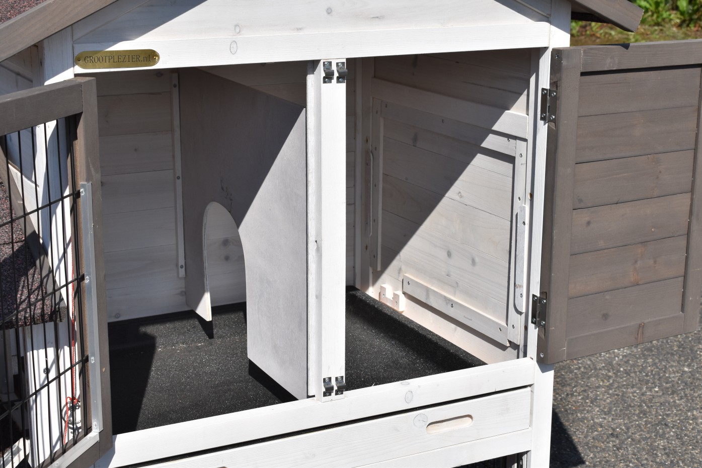 - Jeśli domek dla zwierząt jest używany jako klatka wewnętrzna, zalecamy przykrycie podłogi, aby na przykład zapobiec uszkodzeniom spowodowanym przez mocz