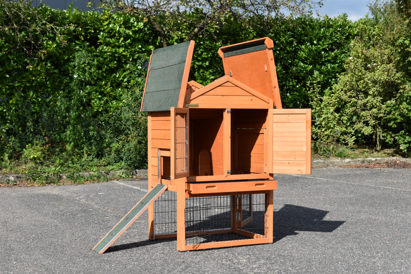 Ten dom dla zwierząt jest wykonany z drewna sosnowego w tradycyjny sposób. Drewno sosnowe jest szczególnie pięknym gatunkiem drewna iglastego, które od dawna jest cenione w naszej ofercie domów dla zwierząt. Odcienie nadają domek drewniany solidny i ciepły wygląd.