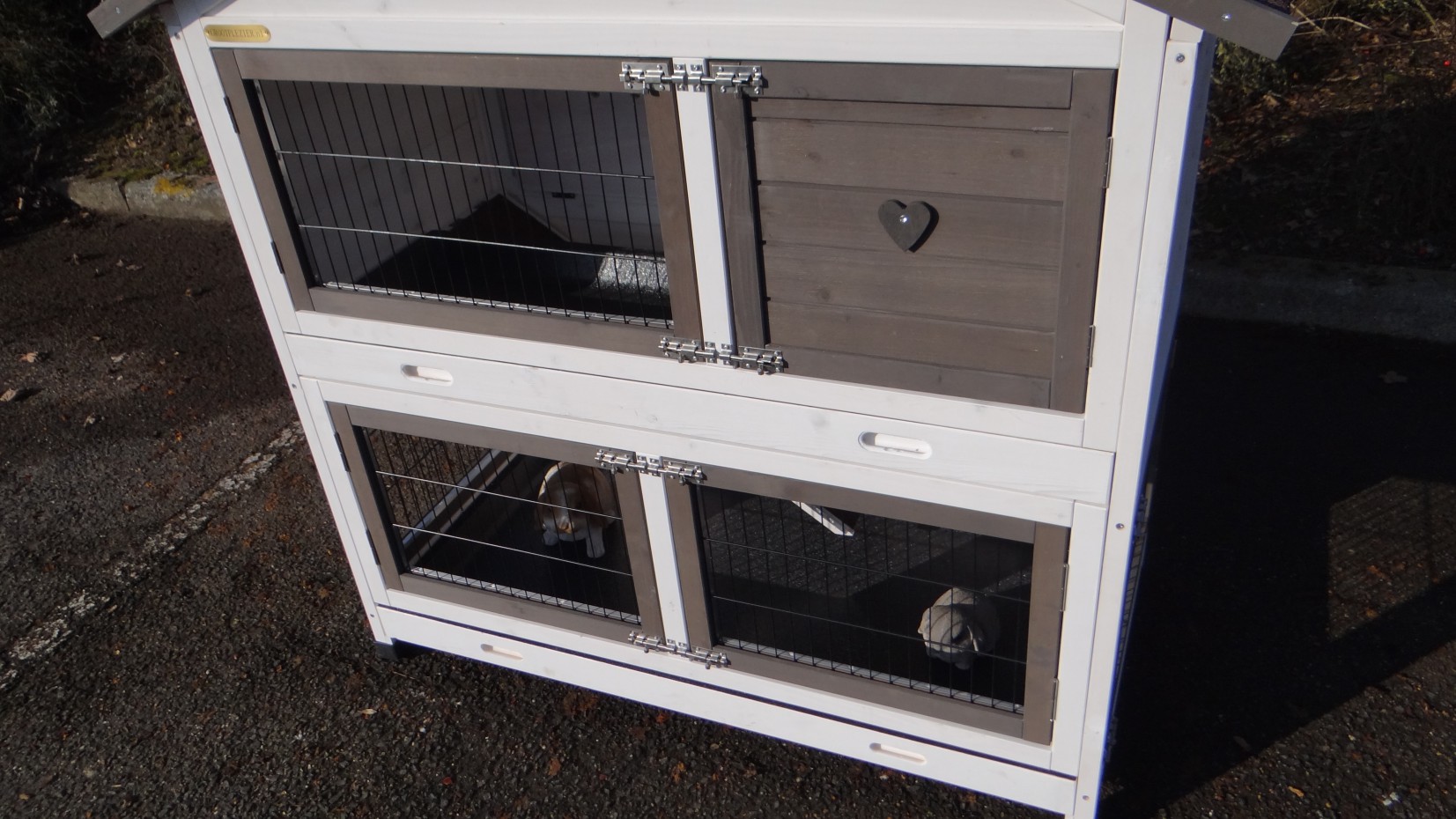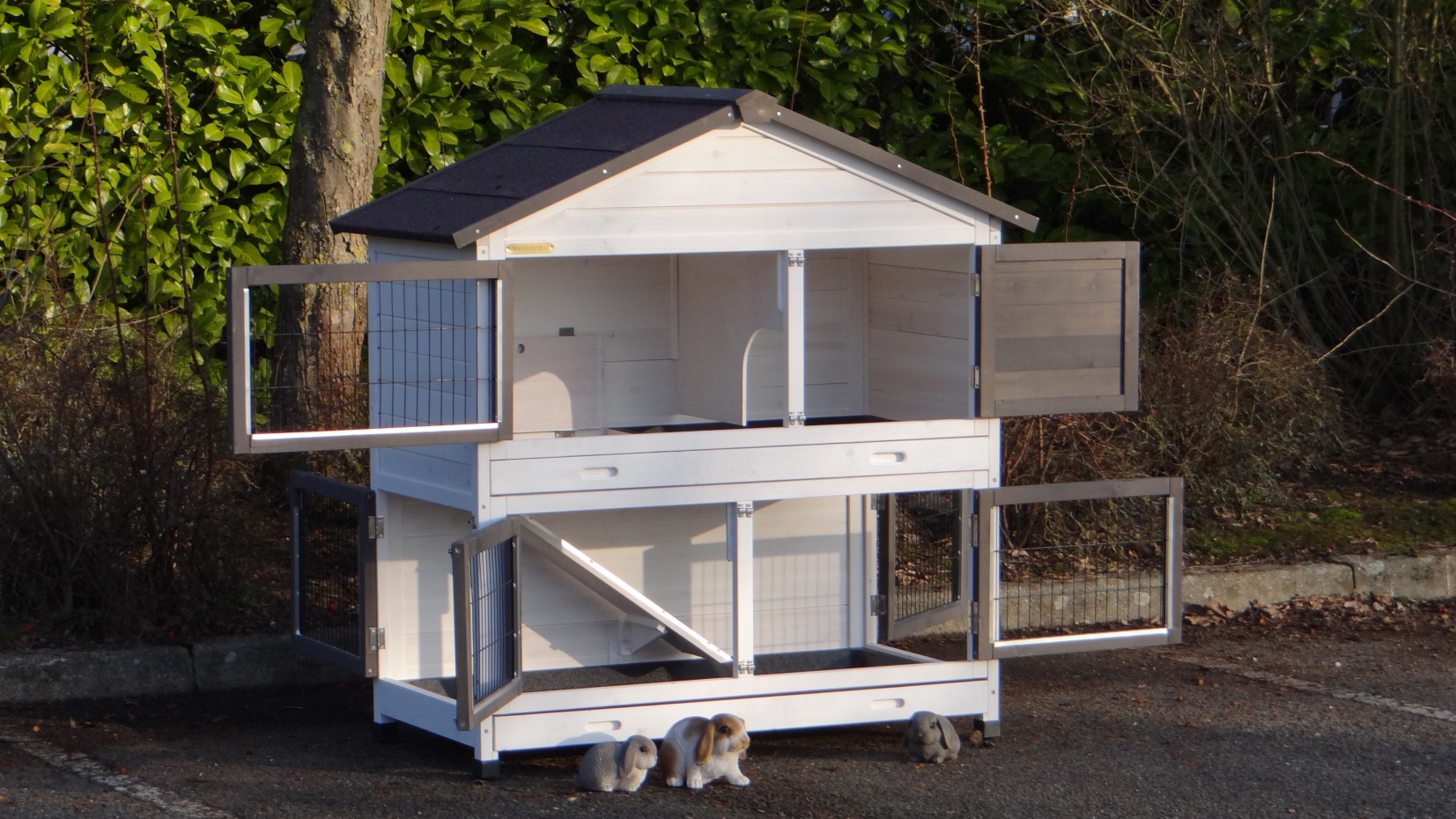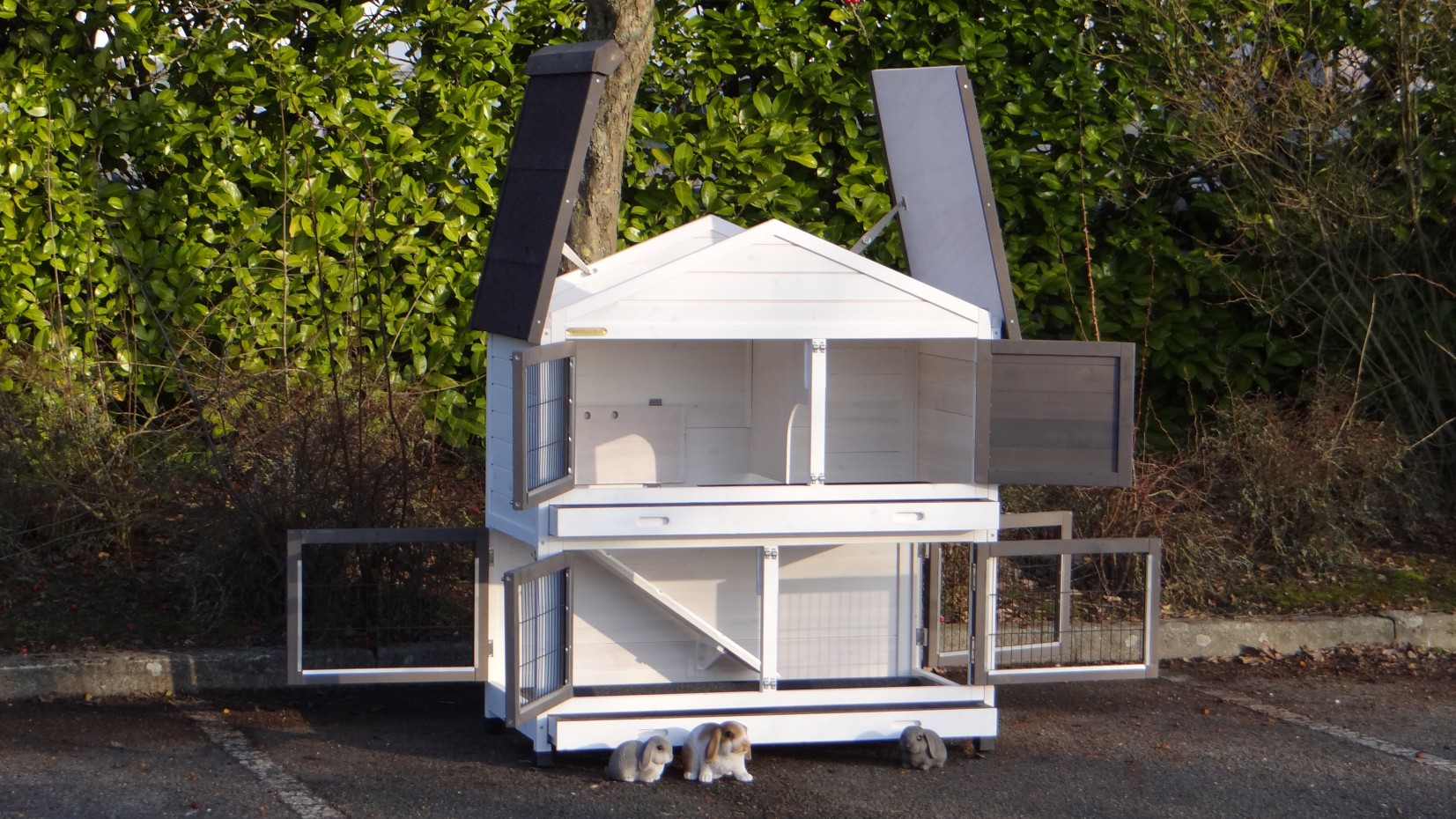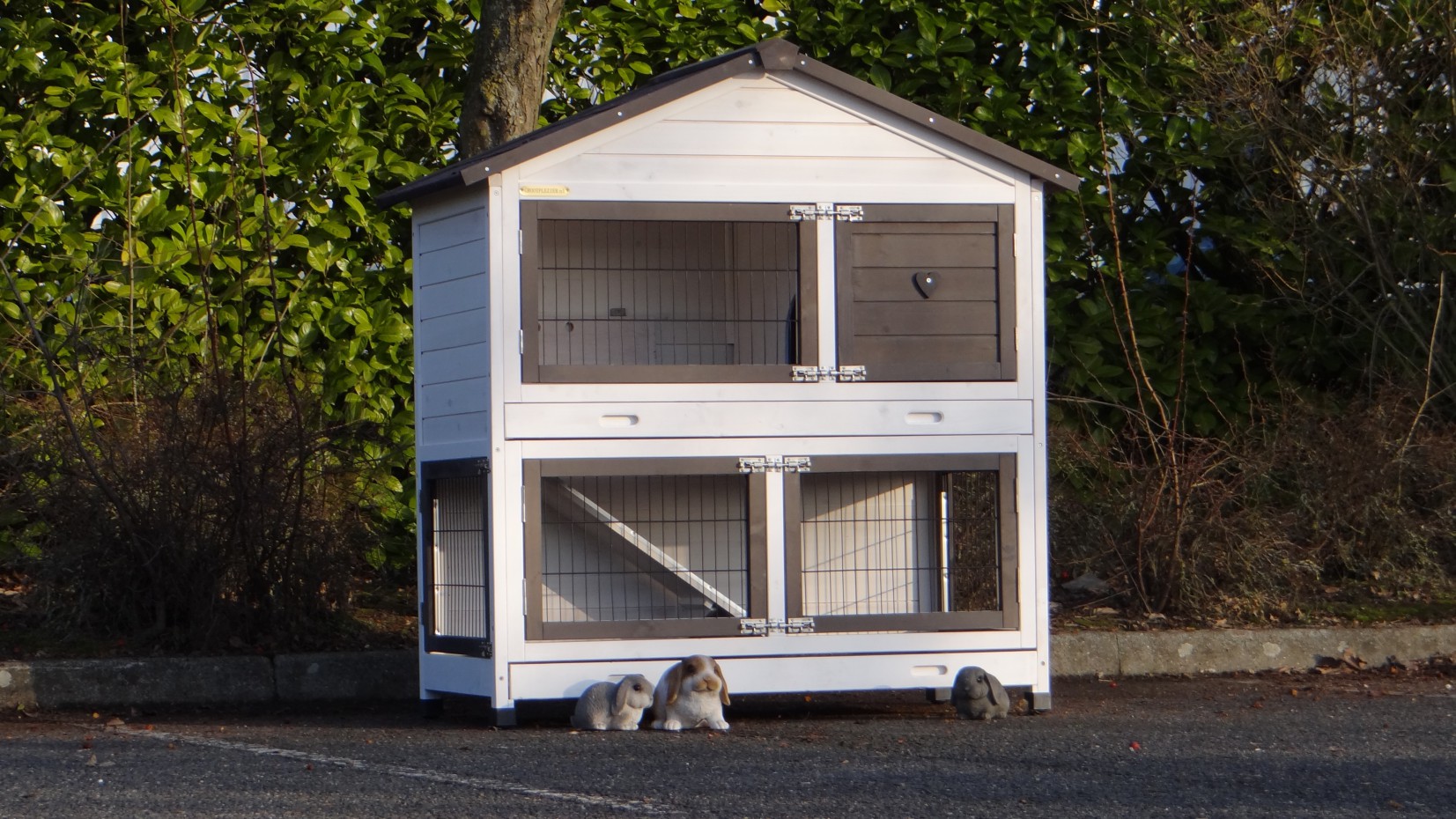 Klatka Excellent Medium w eleganckim stylu white wash z szaro-brązowymi akcentami łączy komfort, estetykę i praktyczność. Głębokie szuflady, schowek na poddaszu i aluminiowe listwy ochronne zapewniają królikom bezpieczne, przytulne miejsce przez cały rok.