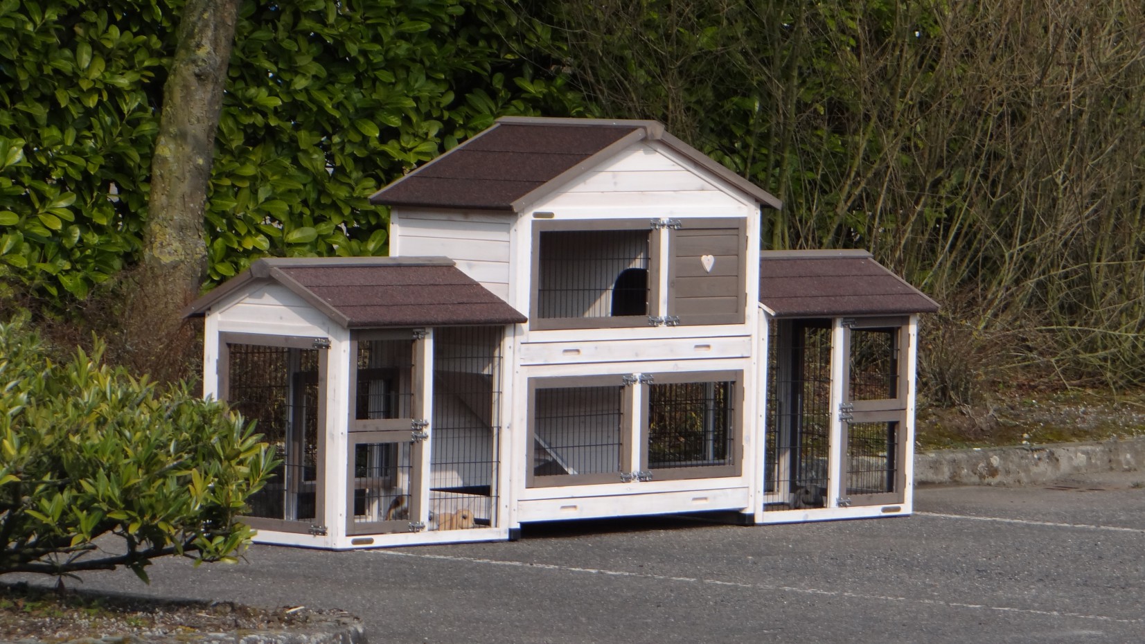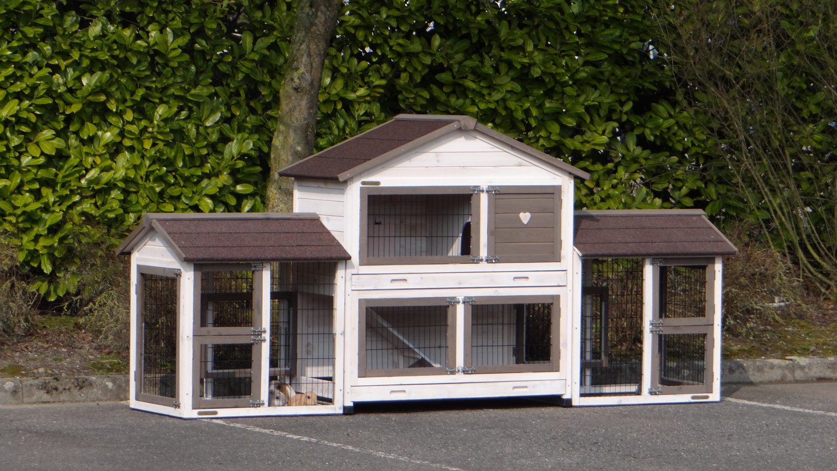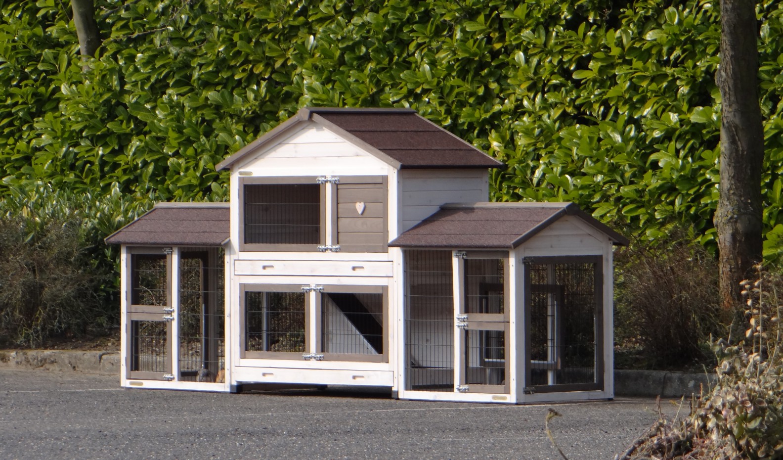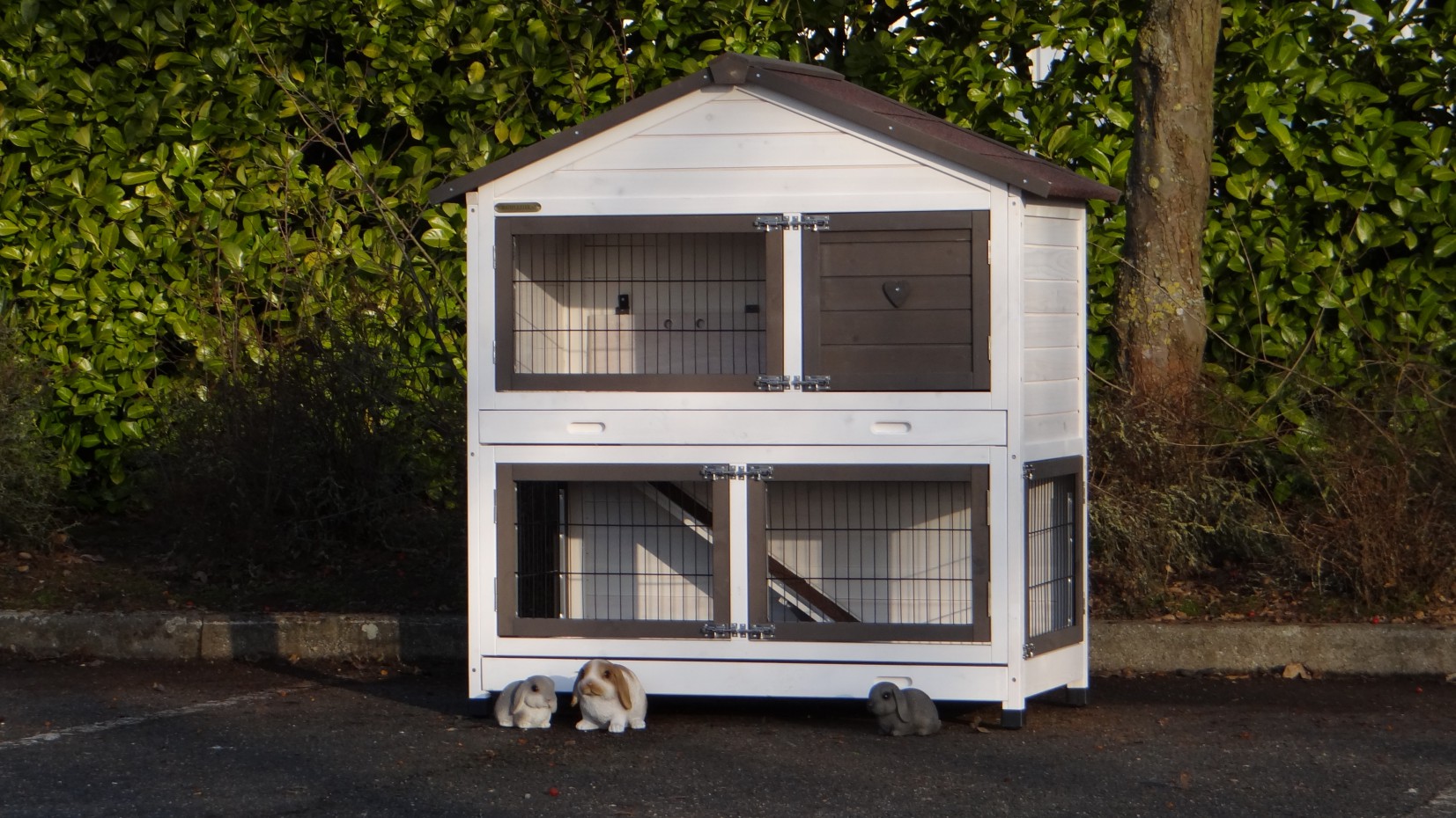 Klatka Excellent Medium w eleganckim stylu white wash z szaro-brązowymi akcentami łączy komfort, estetykę i praktyczność. Głębokie szuflady, schowek na poddaszu i aluminiowe listwy ochronne zapewniają królikom bezpieczne, przytulne miejsce przez cały rok.
