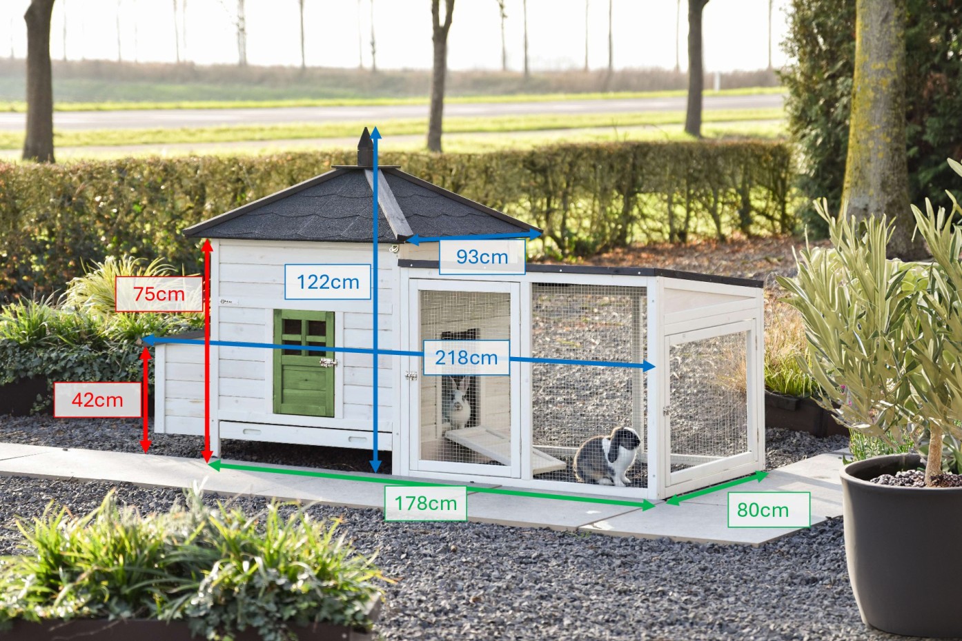 Ten domek jest właściwie kurnikiem, ale bardzo dobrze nadaje się do trzymania dużych królików, takich jak frenchies i króliki olbrzymie. Proszę zwrócić uwagę, że ta budka nie jest dostarczana z aluminiowymi listwami przeciwgnilnymi. Można je zamówić oddzielnie. Maksymalne wymiary, wraz z biegiem i wystającym dachem, to 218x93x122cm.