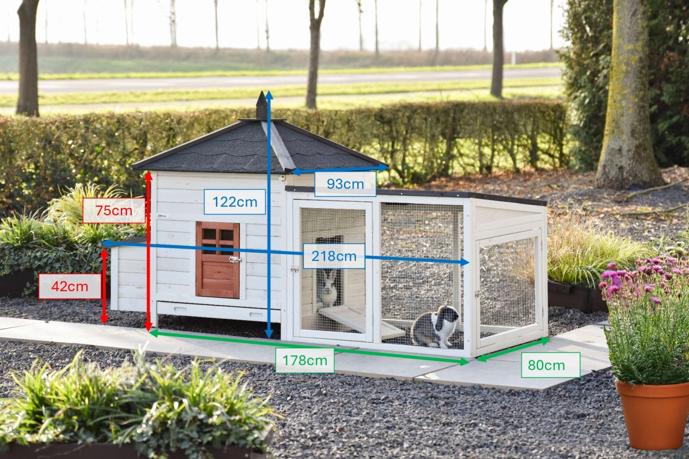 Ten domek jest właściwie kurnikiem, ale bardzo dobrze nadaje się do trzymania dużych królików, takich jak frenchies i króliki olbrzymie. Proszę zwrócić uwagę, że ta budka nie jest dostarczana z aluminiowymi listwami przeciwgnilnymi. Można je zamówić oddzielnie. Maksymalne wymiary, wraz z biegiem i wystającym dachem, to 218x93x122cm.