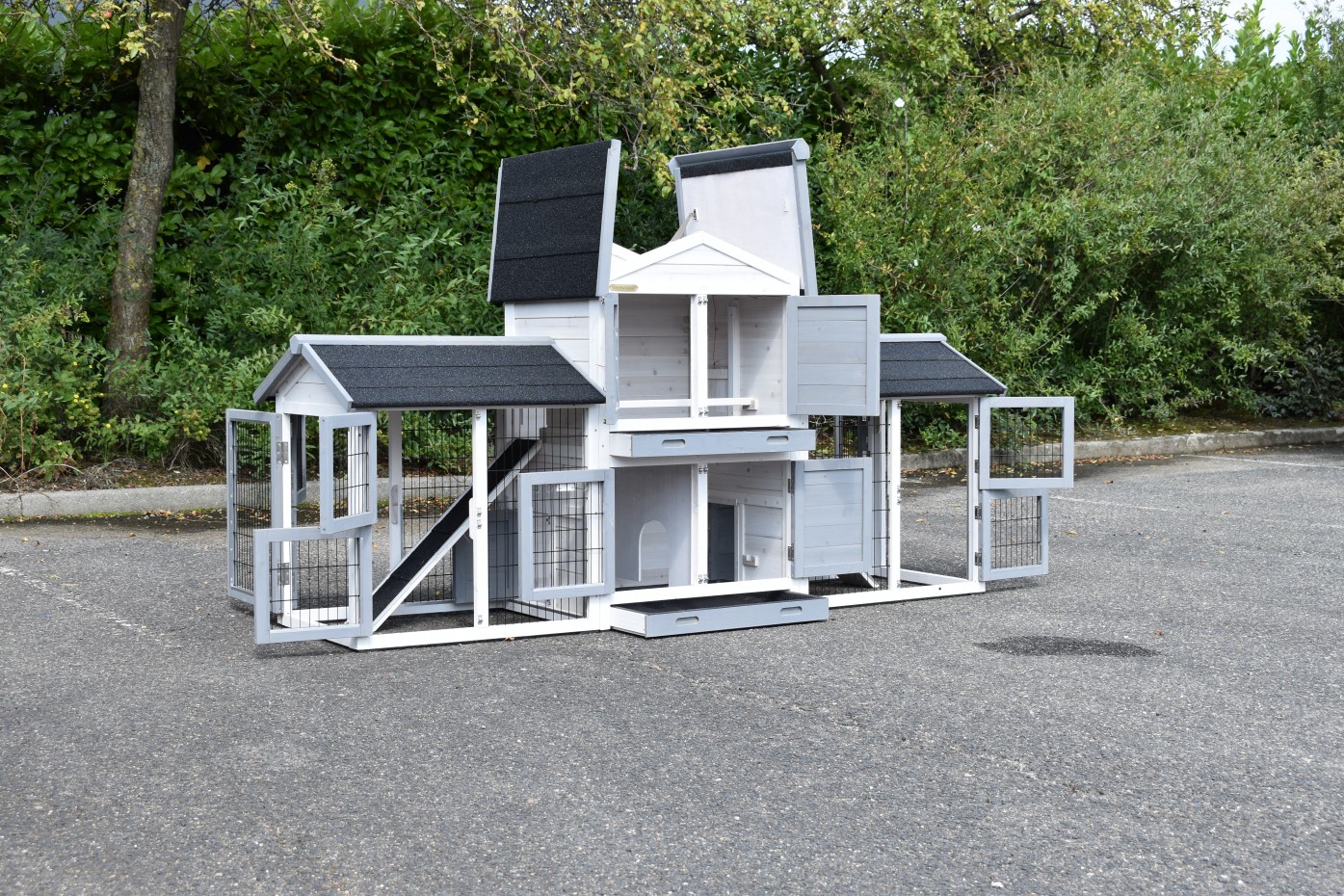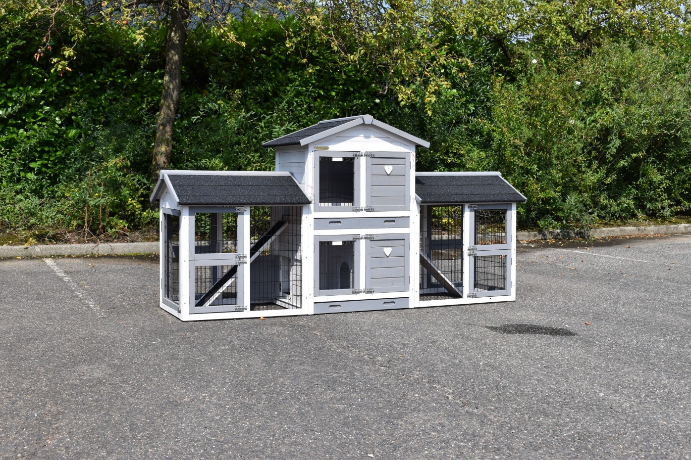 Piękna podwójna mała klatka dla królików ma 2 zamykane sypialnie. Klatka ma duże drzwi i 2 szuflady, dzięki czemu jest łatwa do czyszczenia. Ta klatka oferuje możliwość trzymania kilku zwierząt oddzielnie. Klatka jest wyposażona w składany dach i praktyczny schowek. Klatka jest odpowiednia dla 2 do 4 królików.