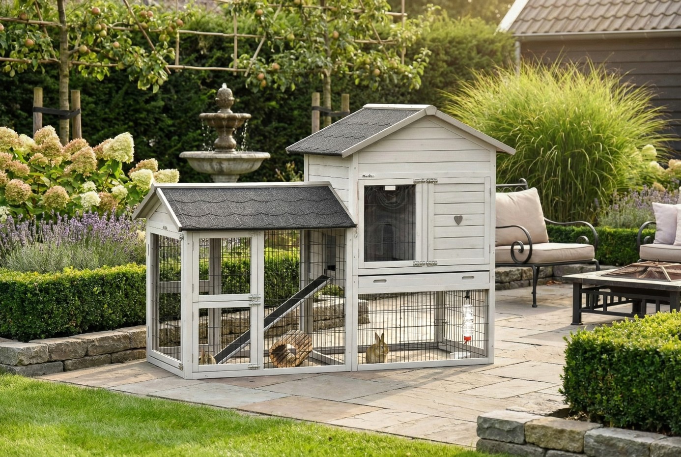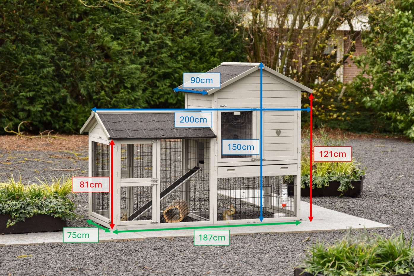 Klatka dla królików Prestige Medium jest wspaniałym schronieniem dla królików z serii Prestige, z krawędziami zapobiegającymi gryzieniu, przestronnymi drzwiami i gumowymi nóżkami, jest wspaniałym schronieniem dla królików. Ta duża budka dla królików jest wykończona w wysokim standardzie, posiada kilka dużych drzwi, dużą budkę nocną i przestronny wybieg. Maksymalne wymiary zewnętrzne tej pięknej budki dla zwierząt wynoszą: 200x90x150cm. (WxDxH) Przy niewielkiej adaptacji można również łatwo zbudować ten domek dla królików w odwrotnym kierunku.