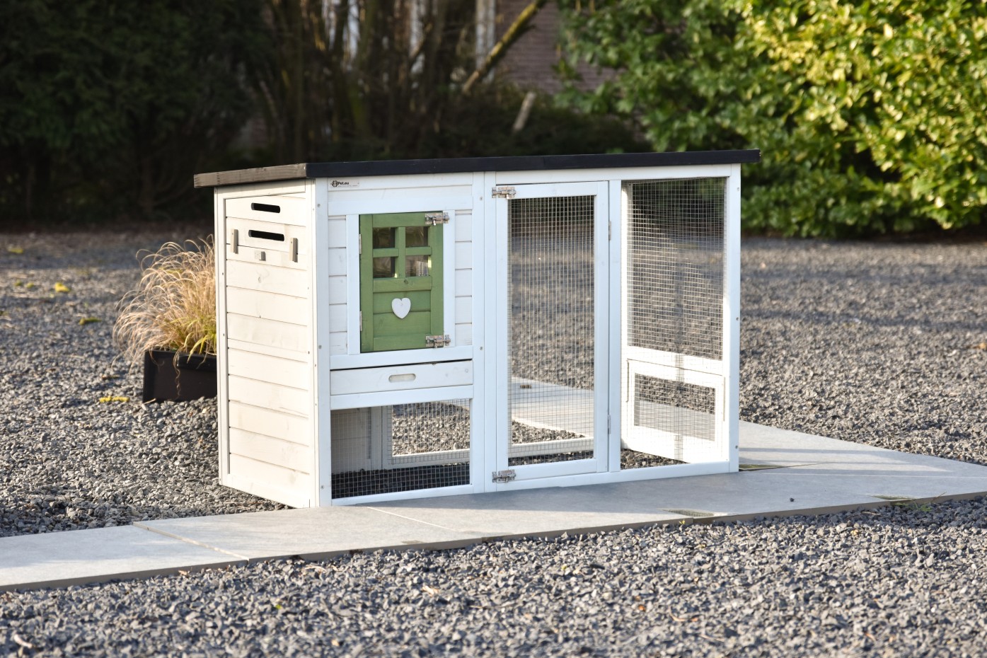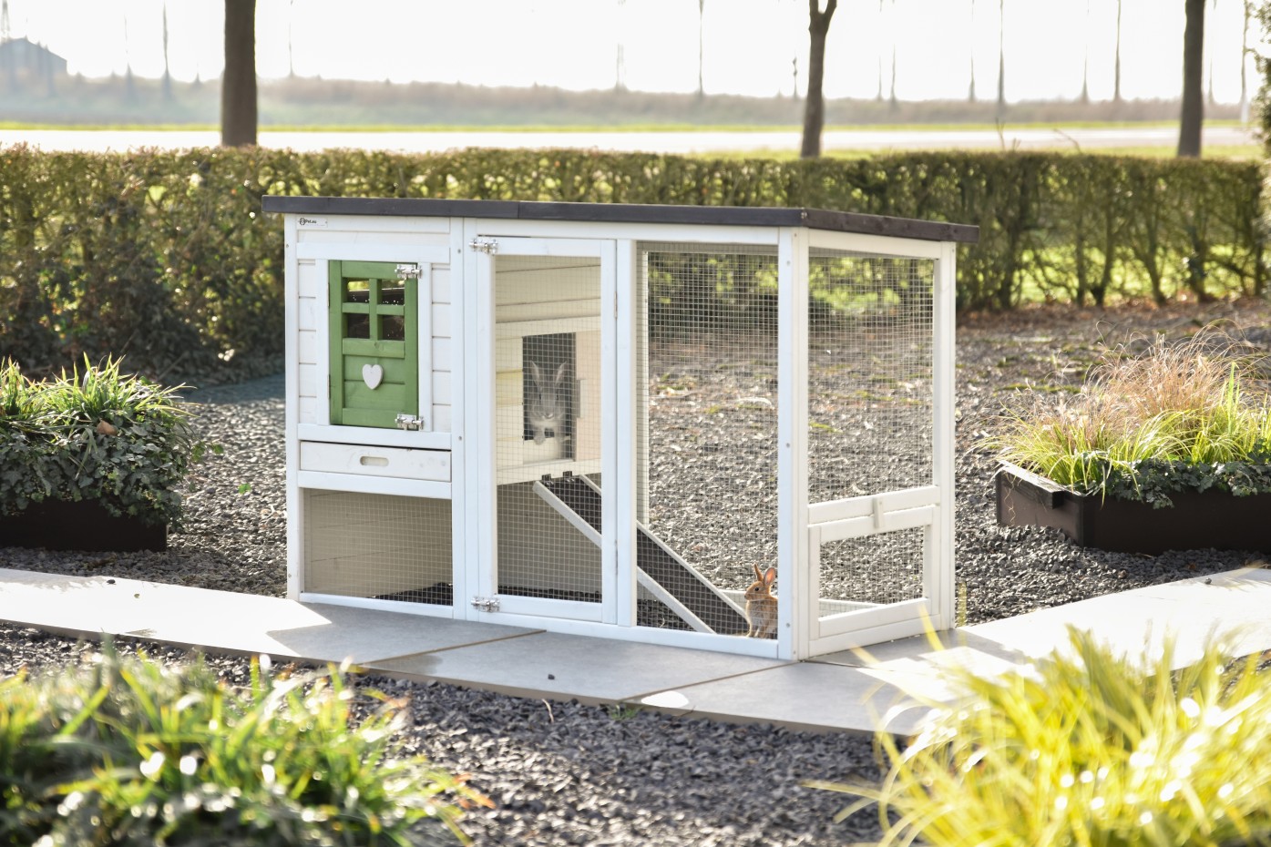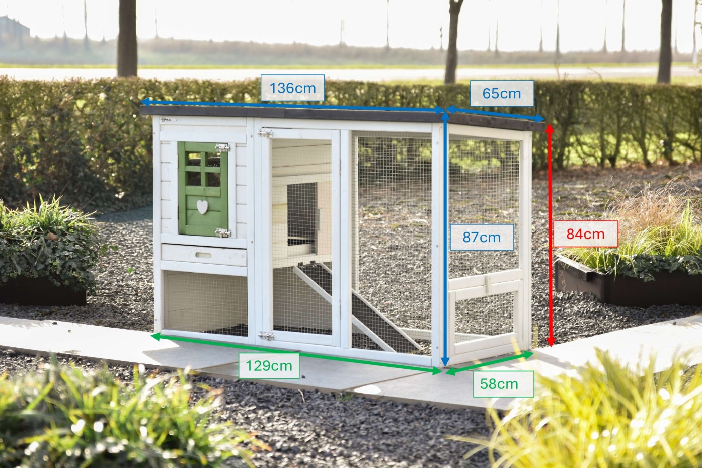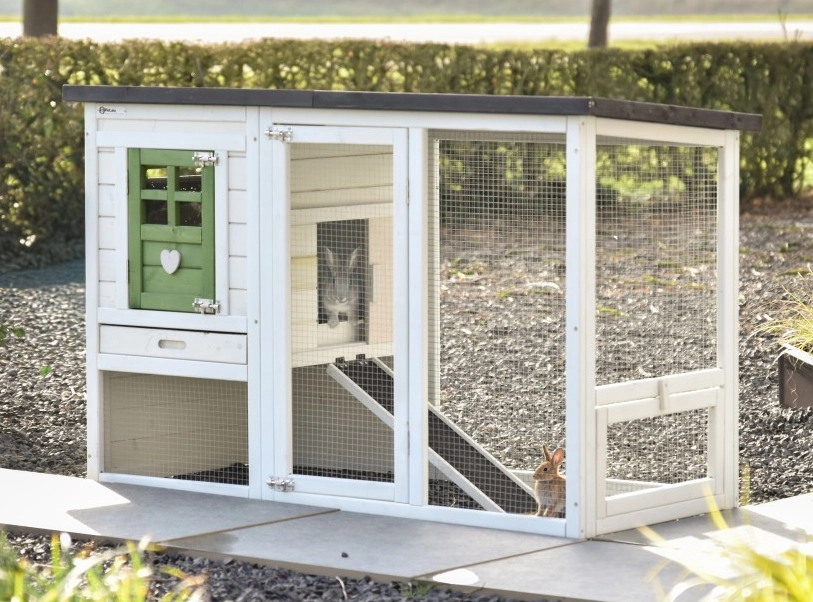 Klatka dla królika Noah to bardzo korzystna cenowo i ładna klatka z częścią nocną oraz wybiegiem. Klatka dla królika Noah jest wyposażona w przestronne drzwiczki oraz praktyczną, wysuwaną kuwetę na odchody w schronieniu nocnym. Noah to bardzo ładna, mała klatka dla 2 małych królików. Maksymalne wymiary razem z dachem wynoszą 136x64x87cm.