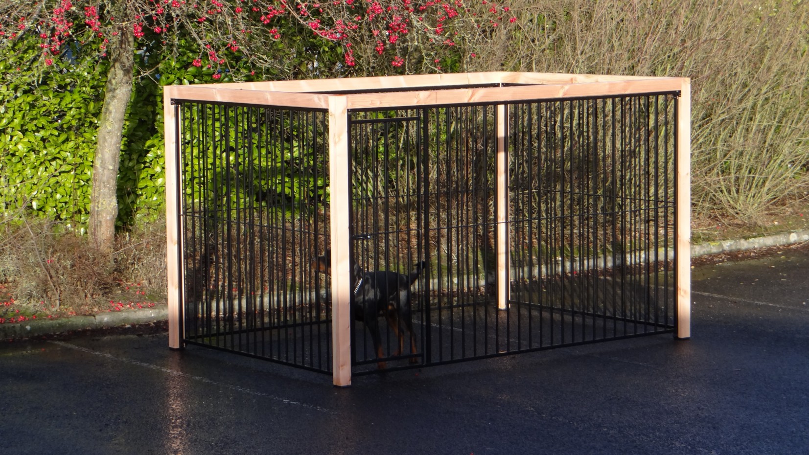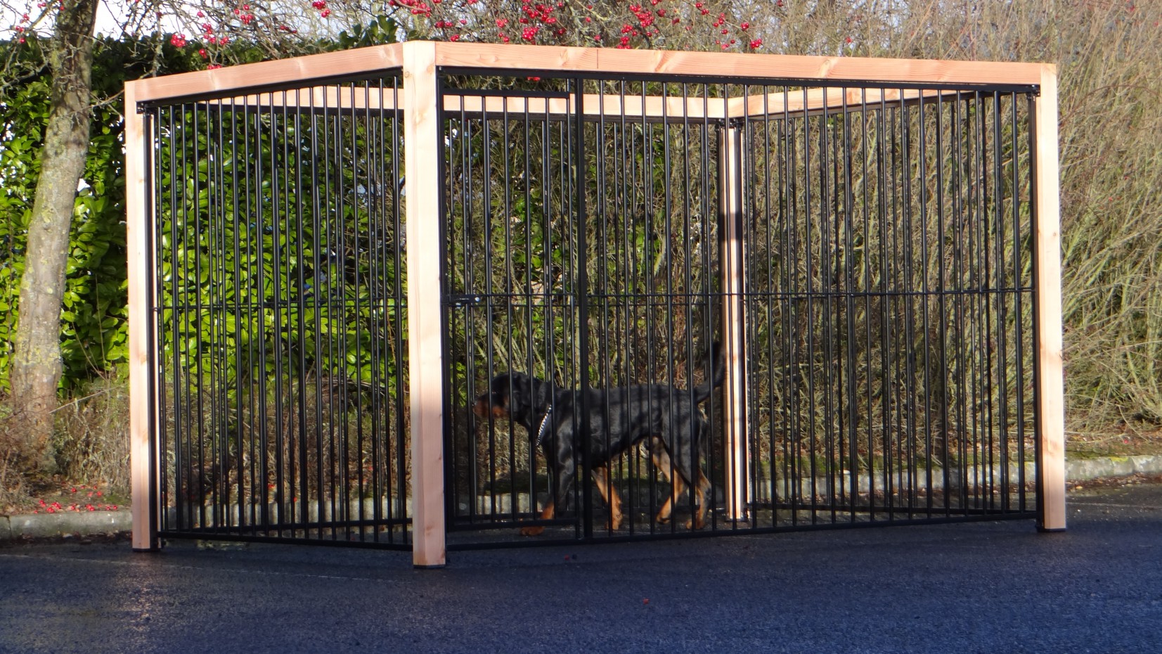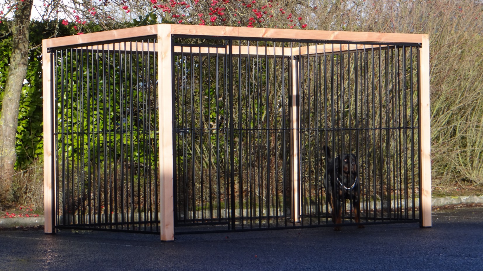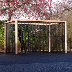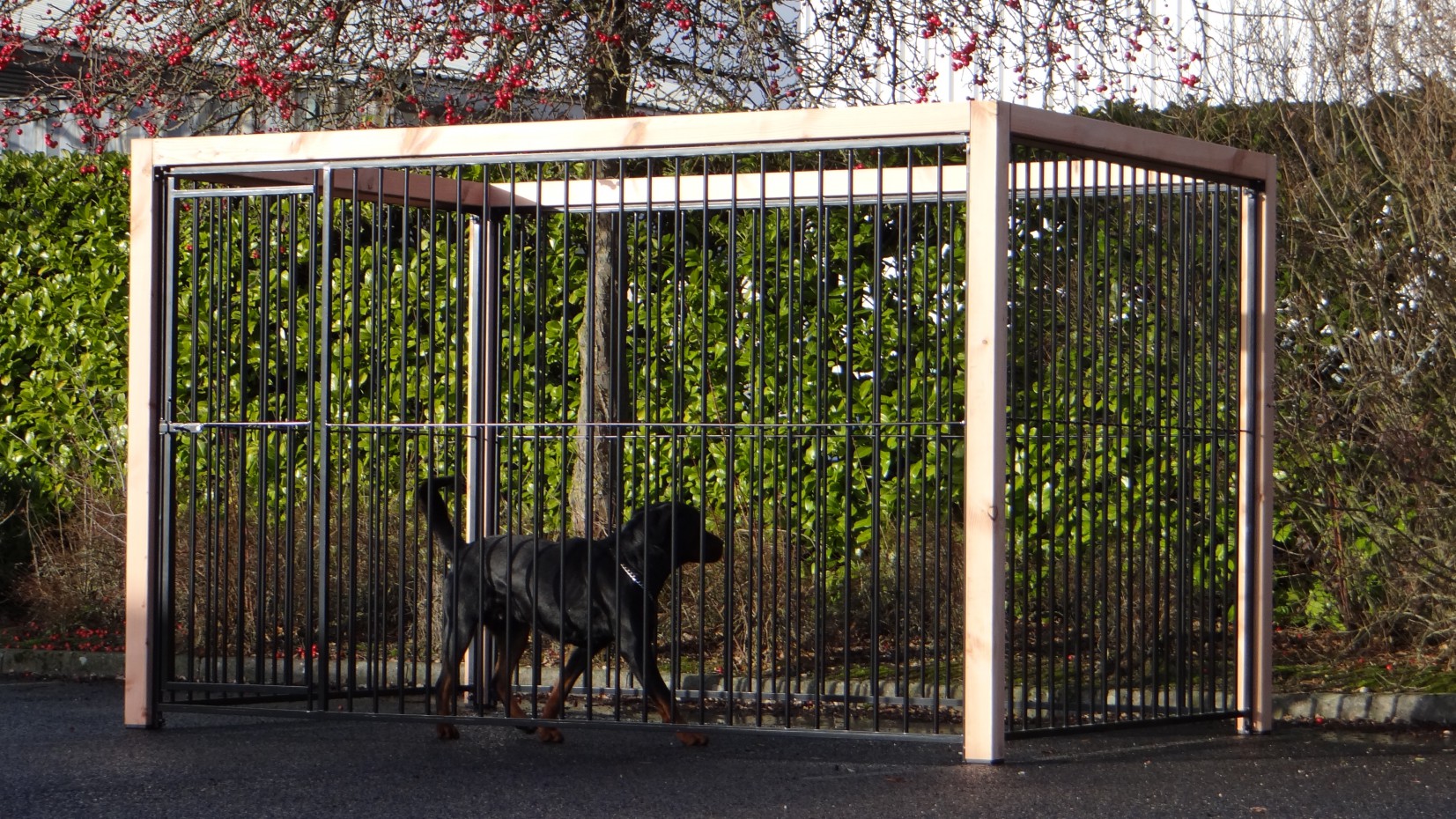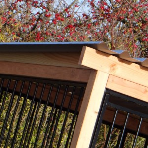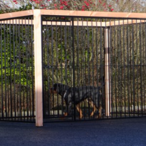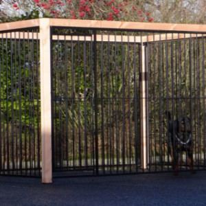 Czarna buda/kennel Flinq z ramą z drewna Douglas to bardzo solidne i eleganckie rozwiązanie dla wybiegu dla psa. Gruba drewniana rama nadaje luksusowy wygląd i sprawia, że kennel jest mocniejszy niż kiedykolwiek. Ten unikalny model dostępny jest w wielu rozmiarach i wariantach; można skorzystać z wygodnego narzędzia 3D do wykonania szkicu.
