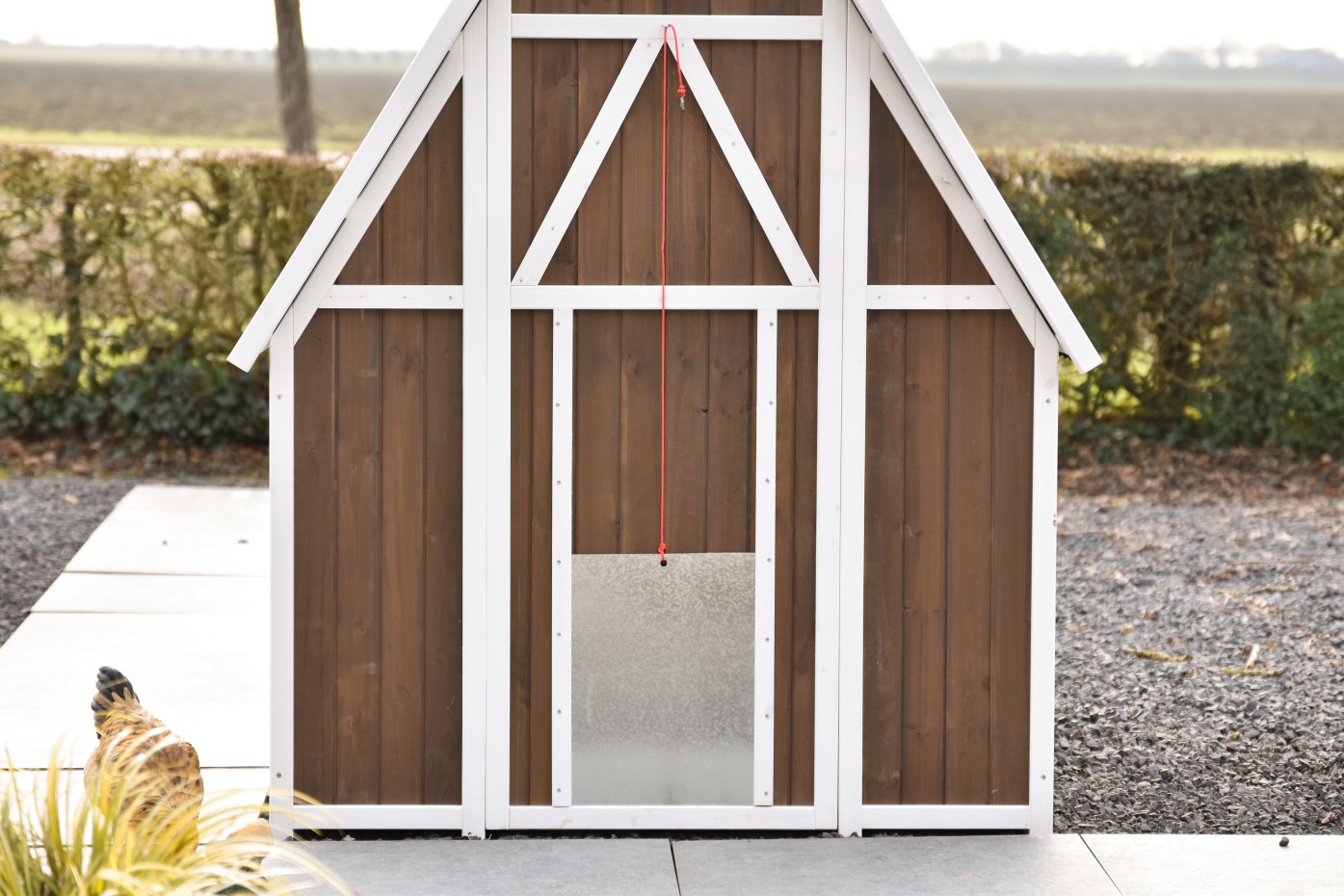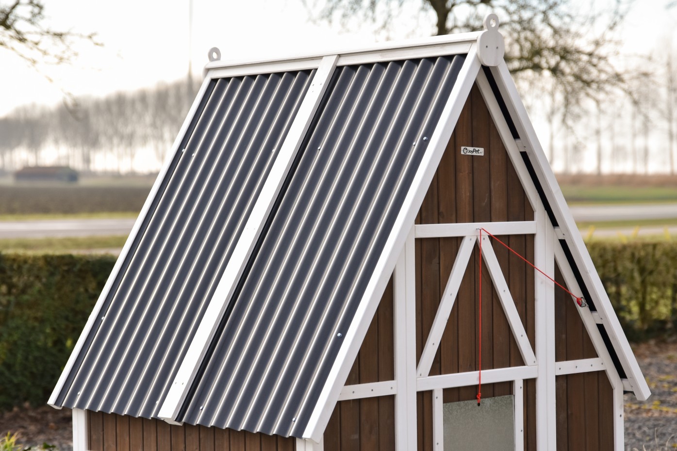 Kurnik można bezpiecznie zamknąć za pomocą aluminiowej, przesuwnej klapy, którą łatwo obsługuje się za pomocą sznurka. Dach z falistych płyt z tworzywa sztucznego dobrze chroni przed deszczem i innymi warunkami atmosferycznymi.