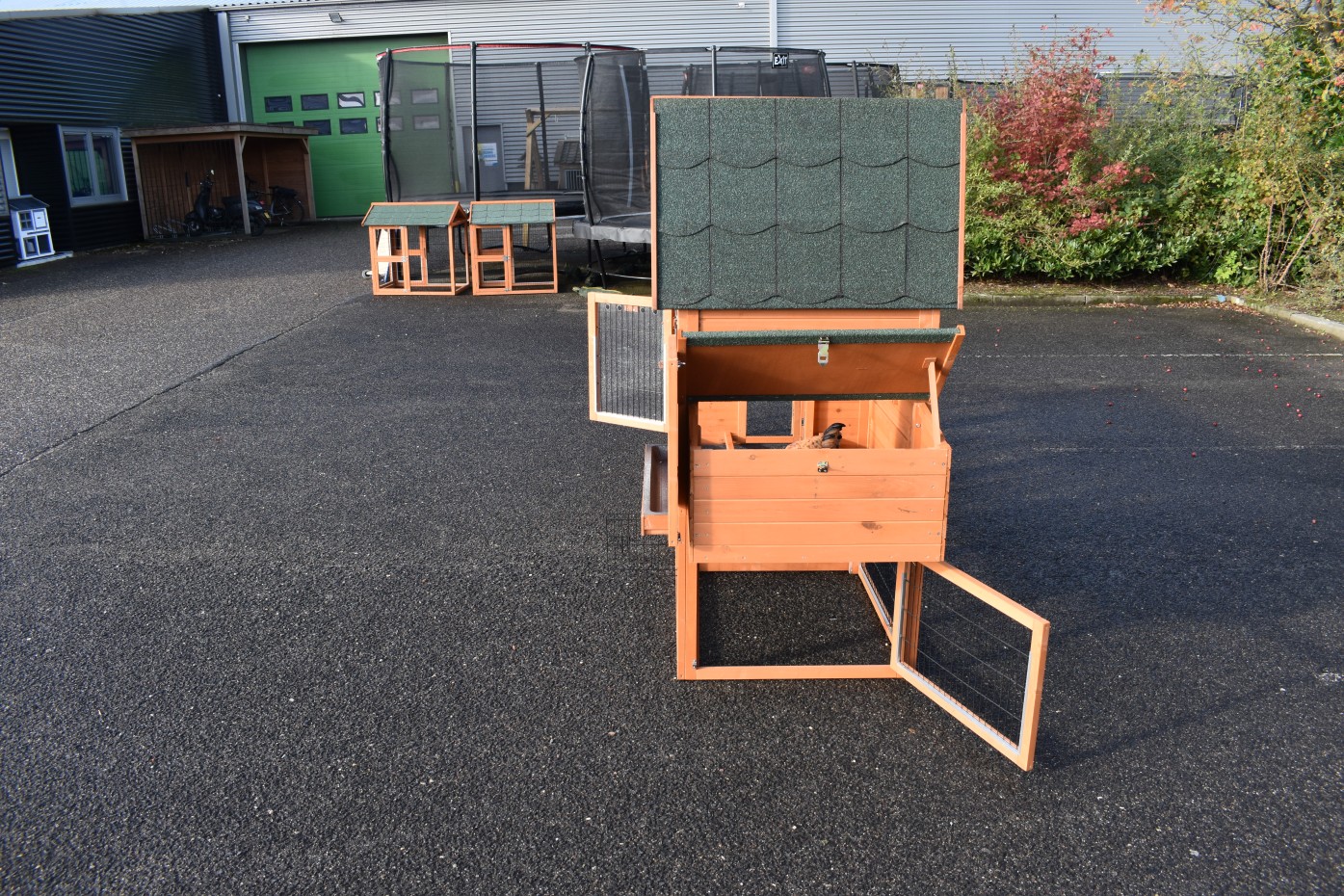 Ten praktyczny kurnik jest dopracowany w każdym detalu — posiada szerokie drzwiczki oraz przestronną część nocną wyposażoną w dwie grzędy.