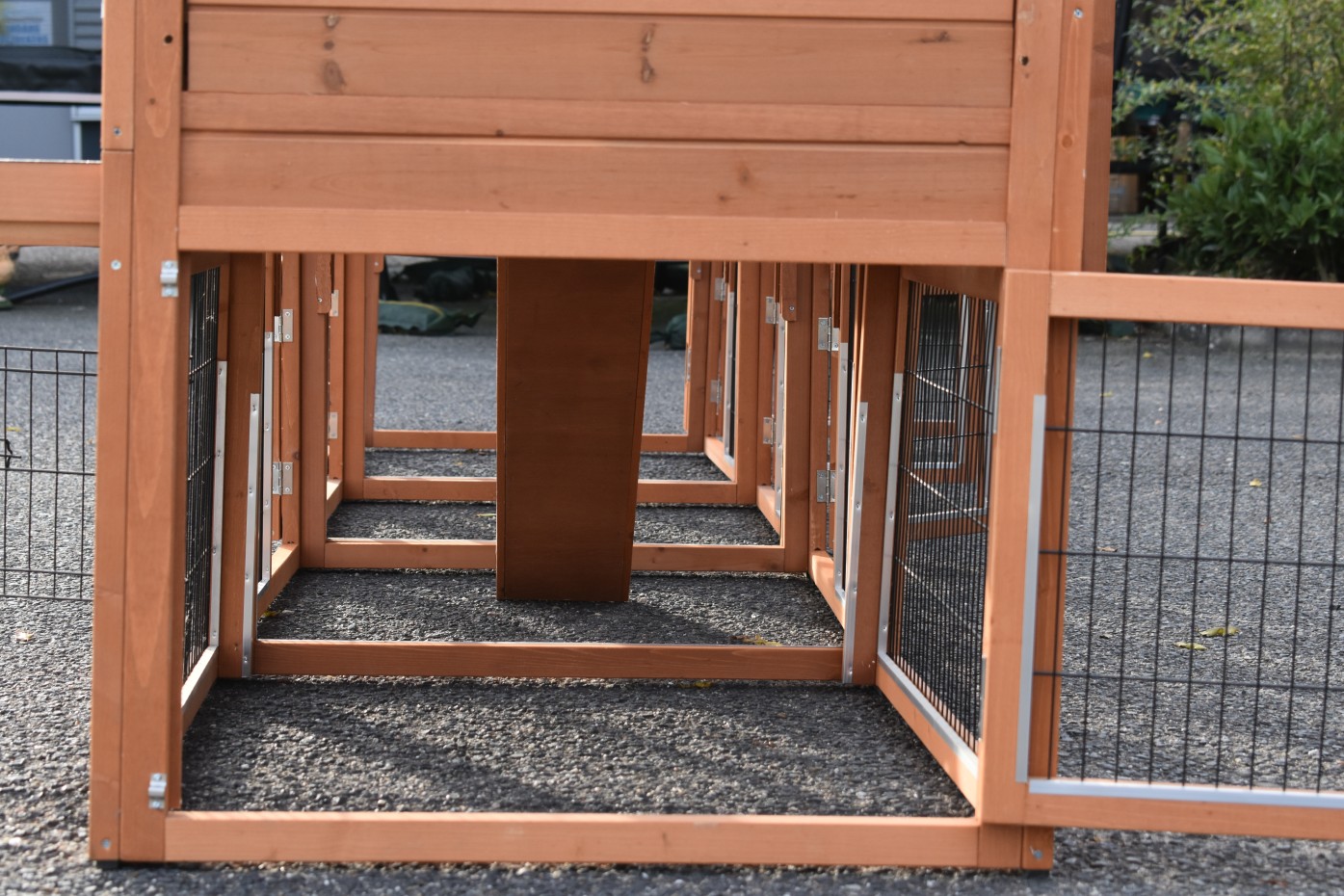 Ten praktyczny kurnik jest dopracowany w każdym detalu — posiada szerokie drzwiczki oraz przestronną część nocną wyposażoną w dwie grzędy.