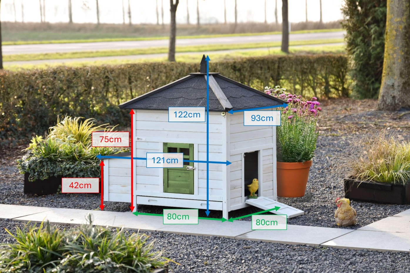 Wymiary zewnętrzne z dachem i budką lęgową (SxGxW) 121x93x122cm