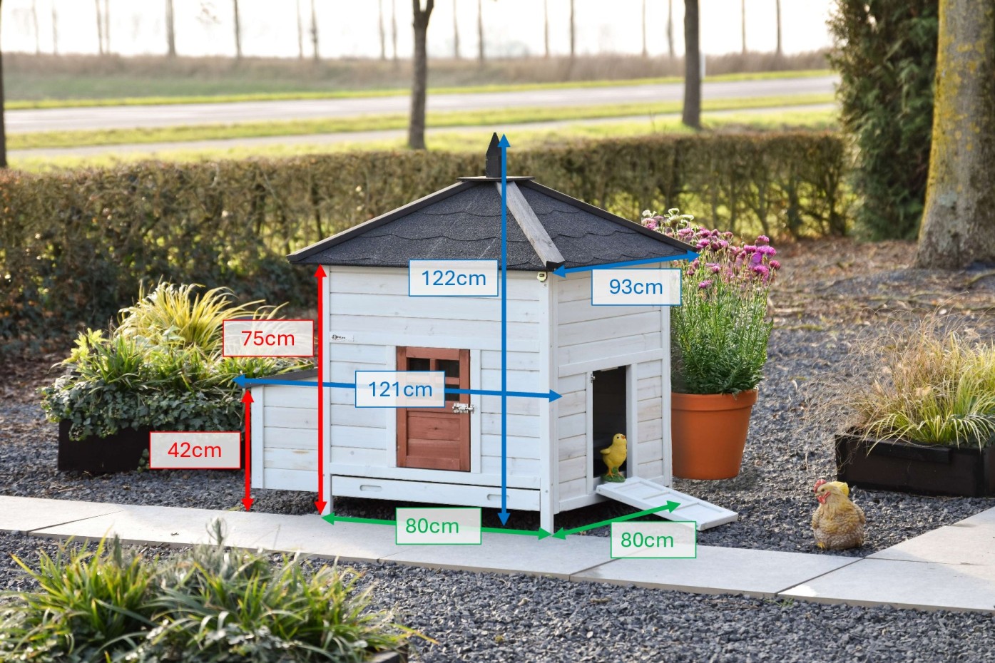 Wymiary zewnętrzne z dachem i budką lęgową (SxGxW) 121x93x122cm