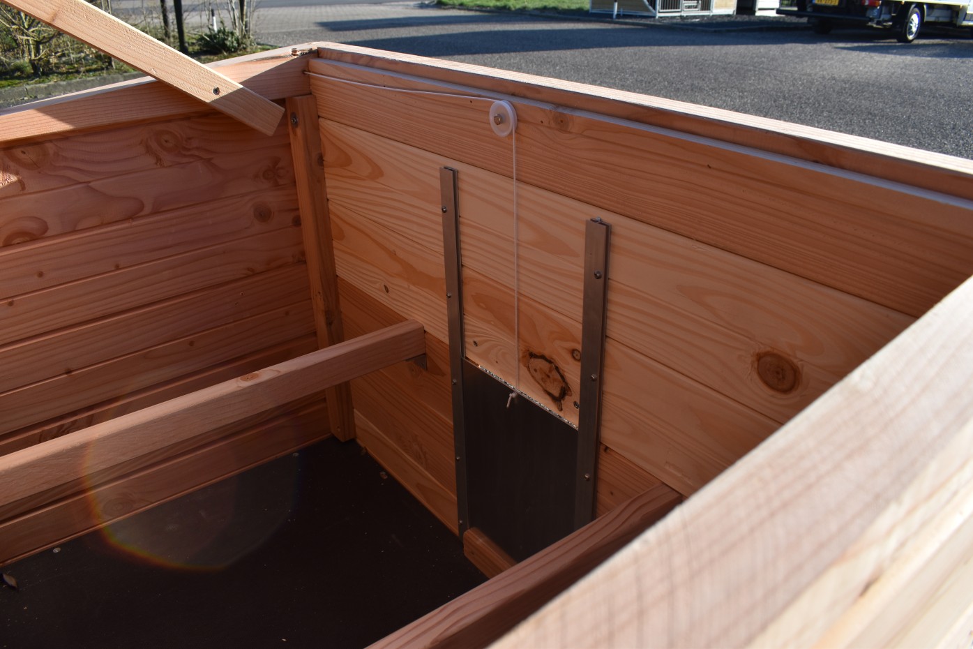 - Zamykana budka nocna: wyposażona w aluminiową przesuwaną roletę od wewnątrz