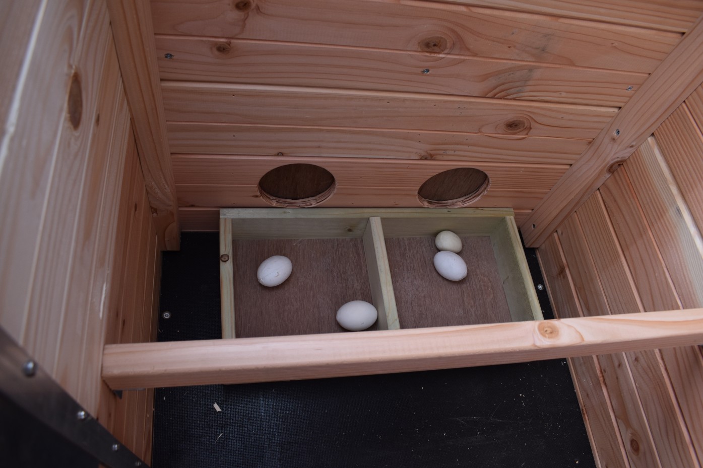 Ponieważ kurnik stoi na wysokich nogach, kury mogą się pod nim schronić lub można tam umieścić karmnik.