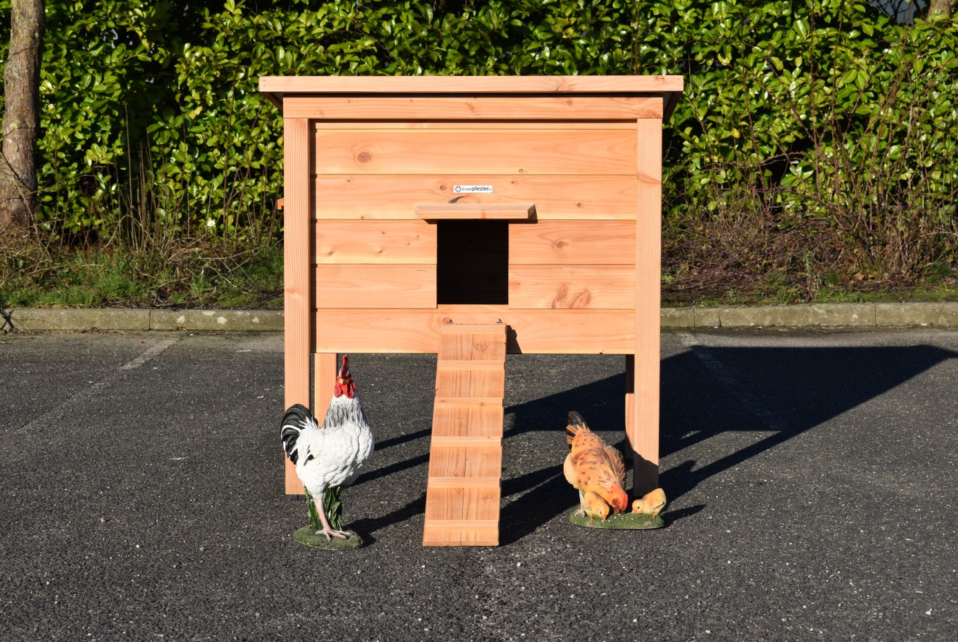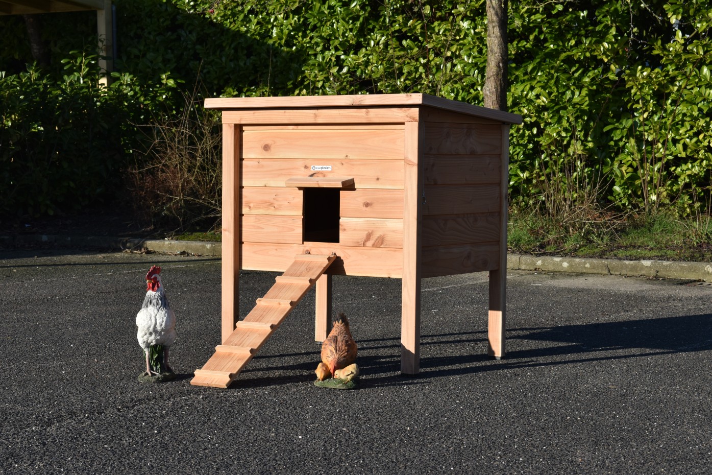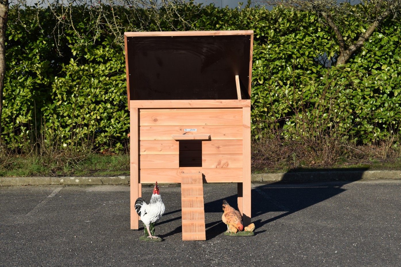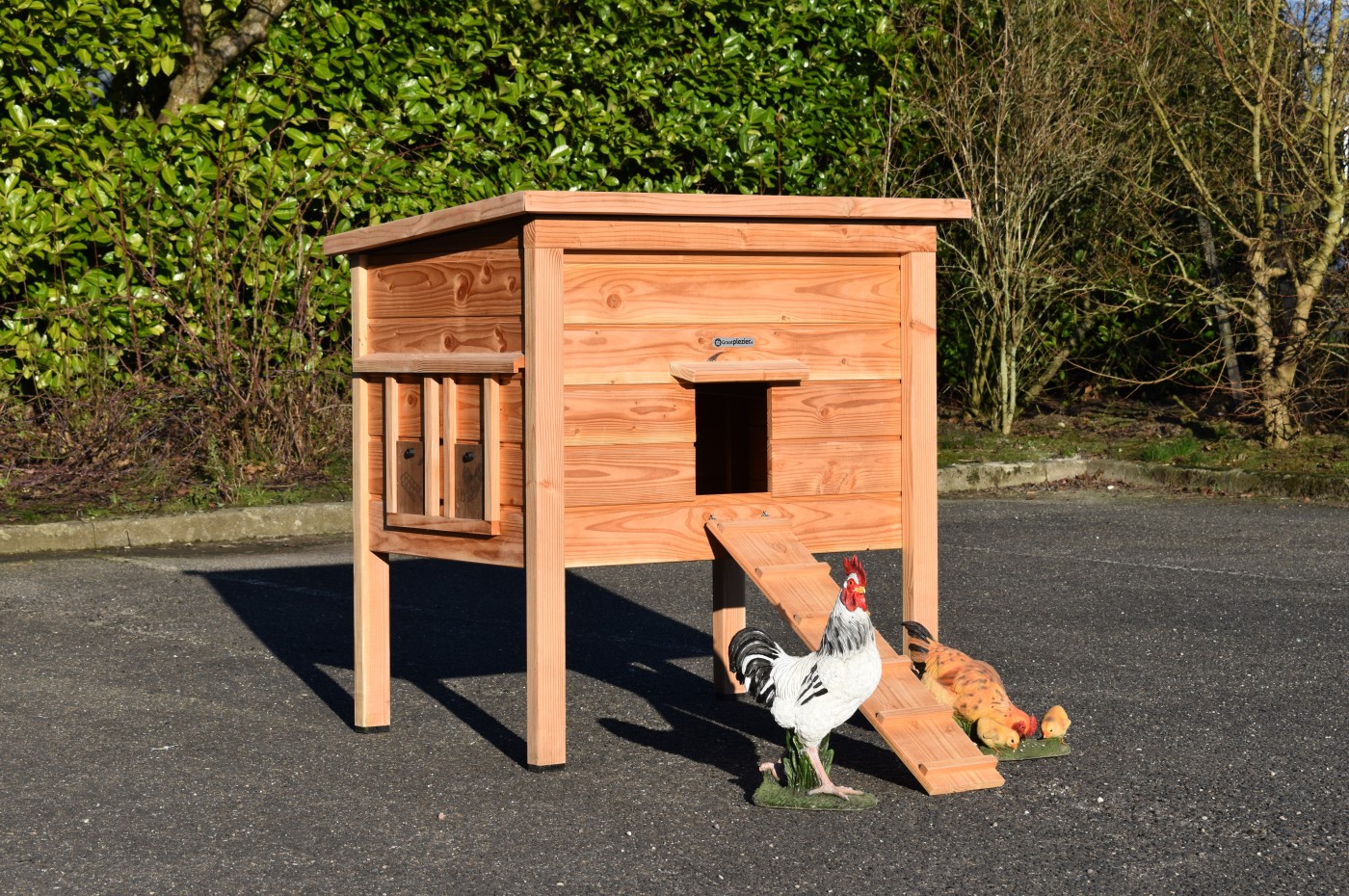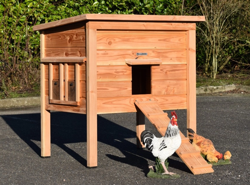 Wykonany z drewna daglezjowego i sklejki betonowej, kurnik nie wymaga malowania, aby zachować trwałość i odporność na warunki atmosferyczne.