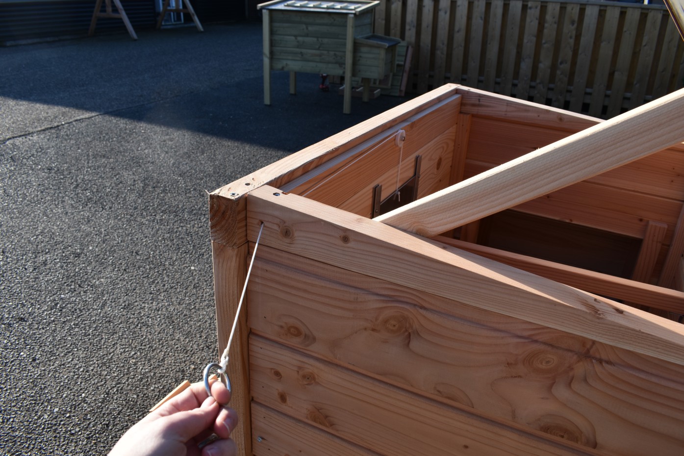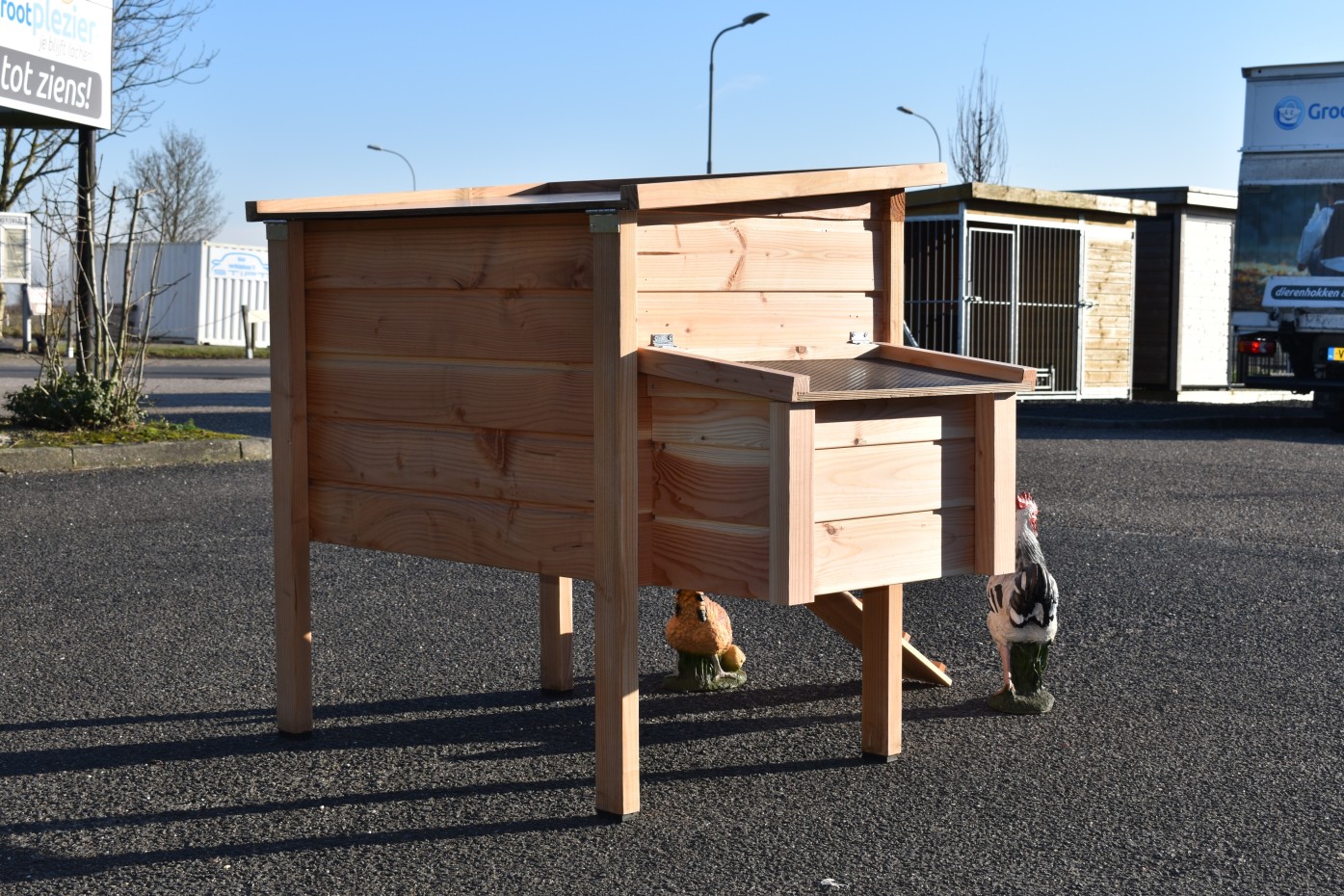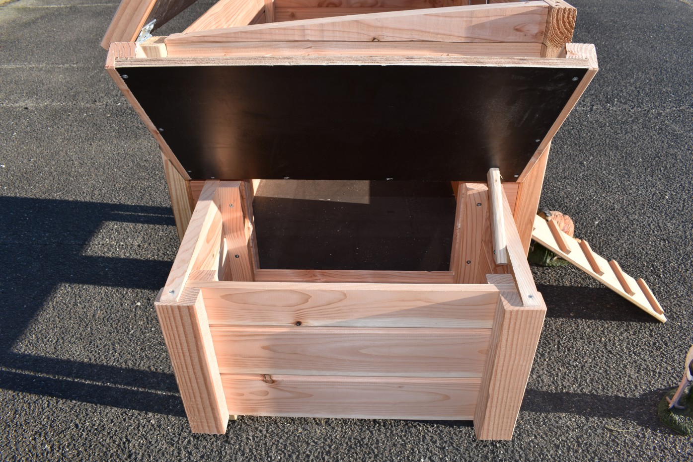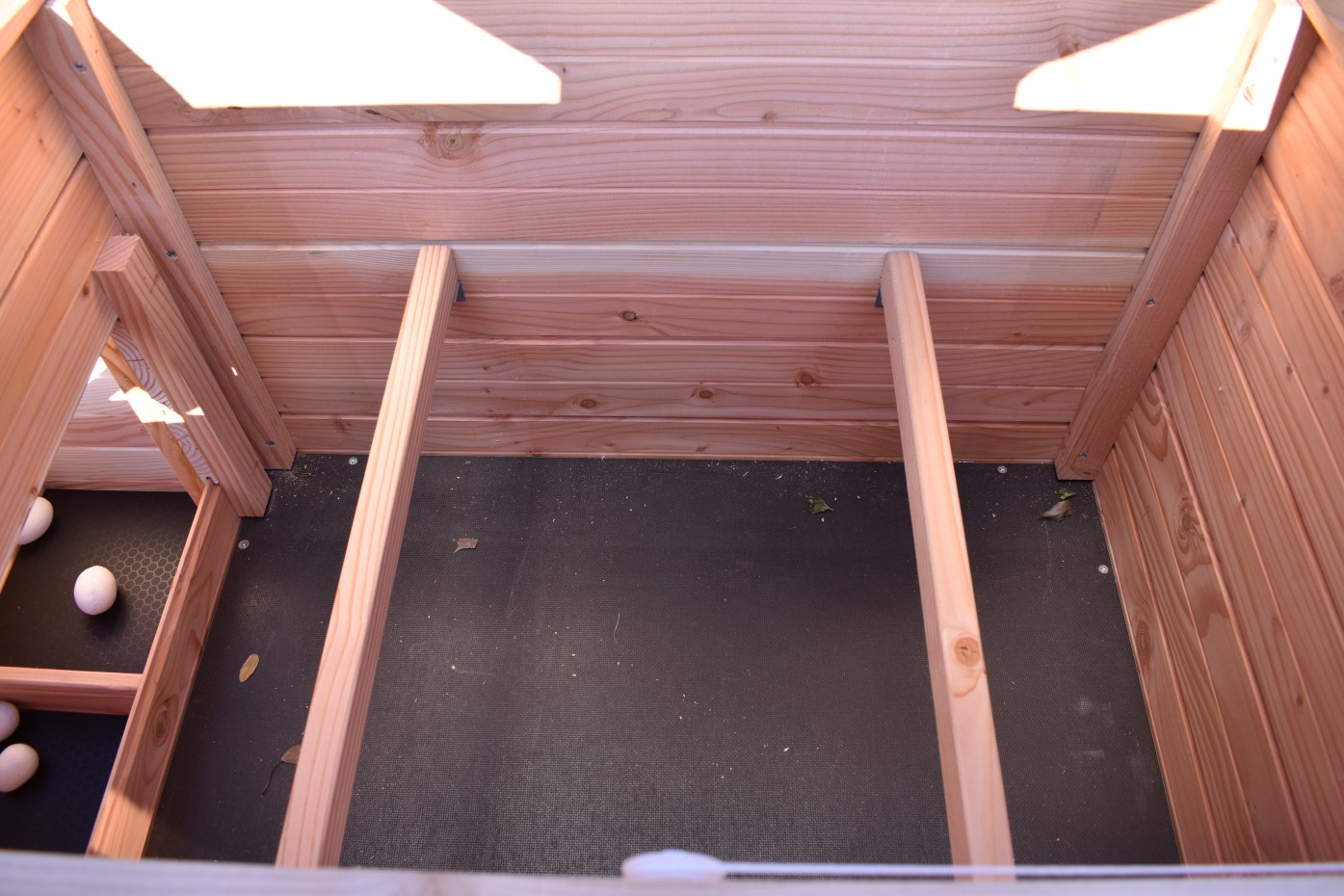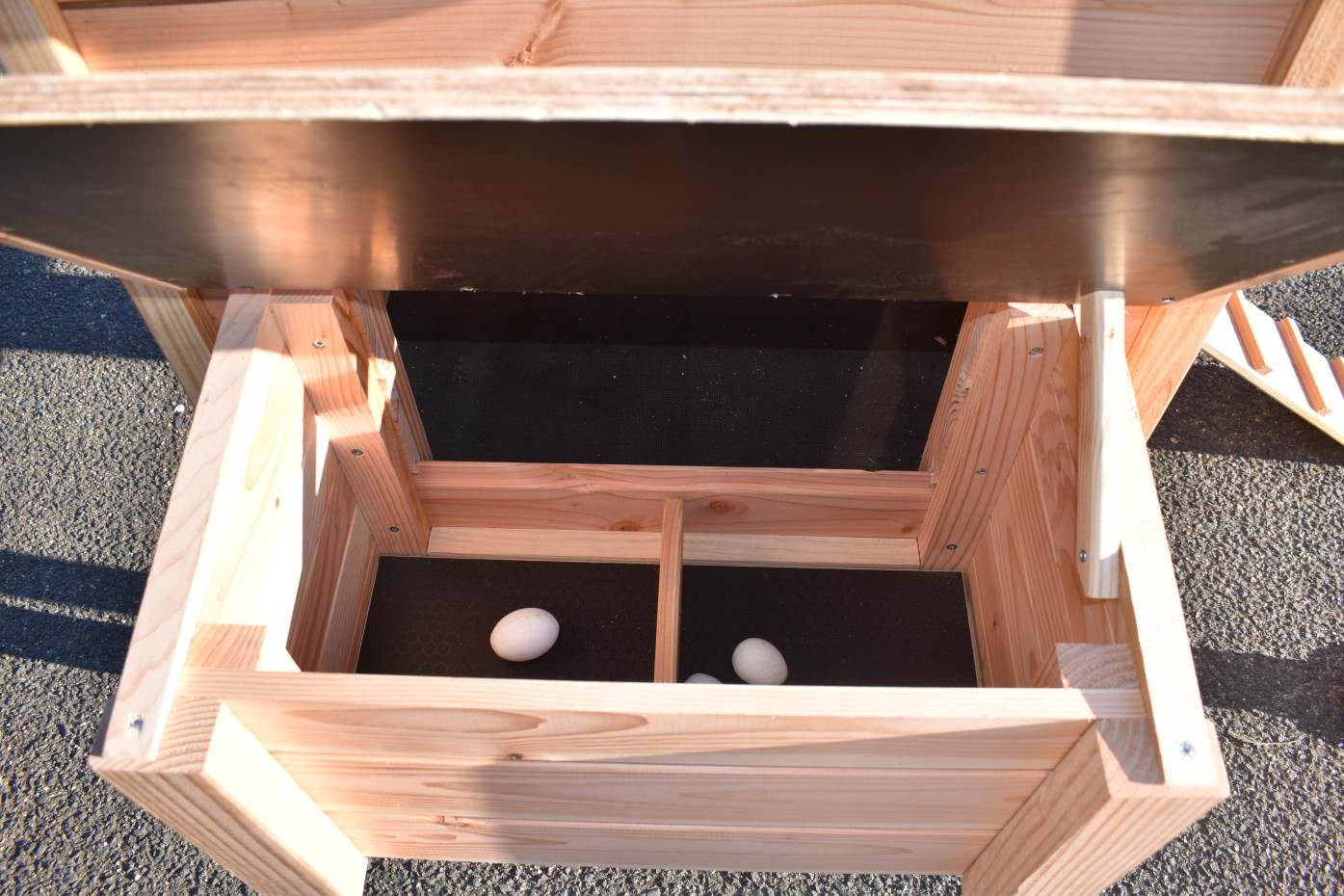 Ponieważ kurnik stoi na wysokich nogach, kury mogą się pod nim schronić lub można tam umieścić karmnik.