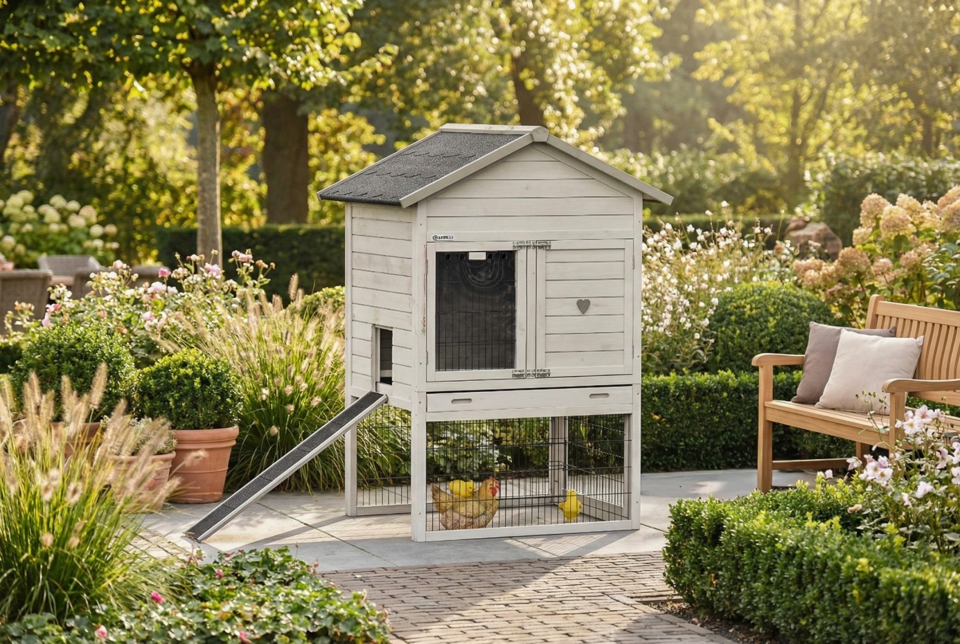 Ten praktyczny kurnik jest dopracowany w każdym detalu — posiada szerokie drzwiczki oraz przestronną część nocną wyposażoną w dwie grzędy.