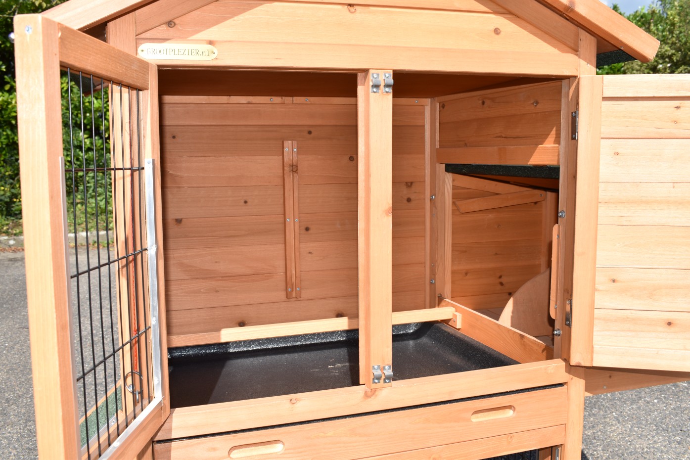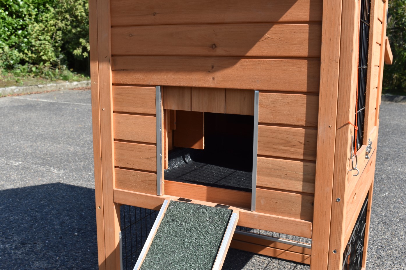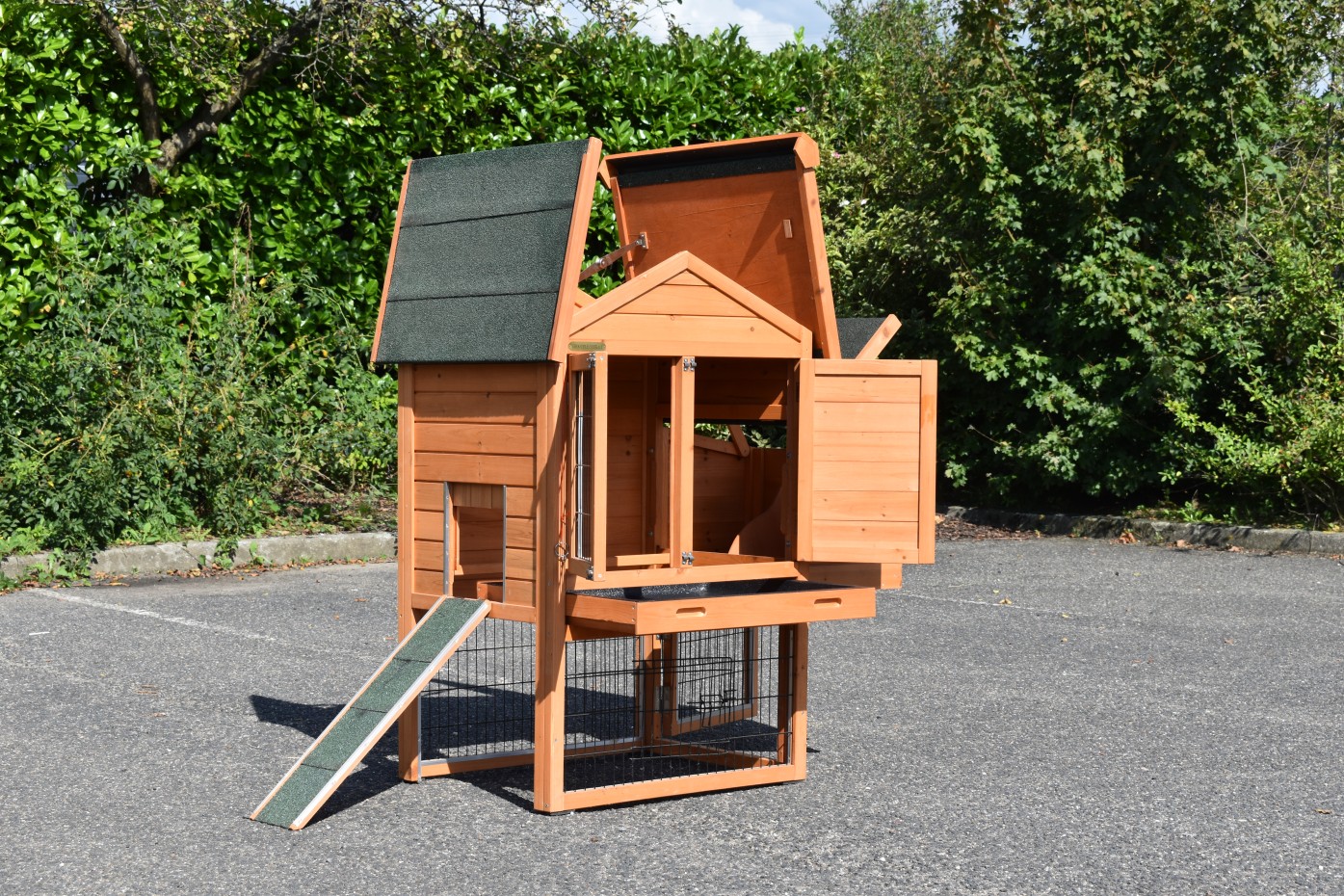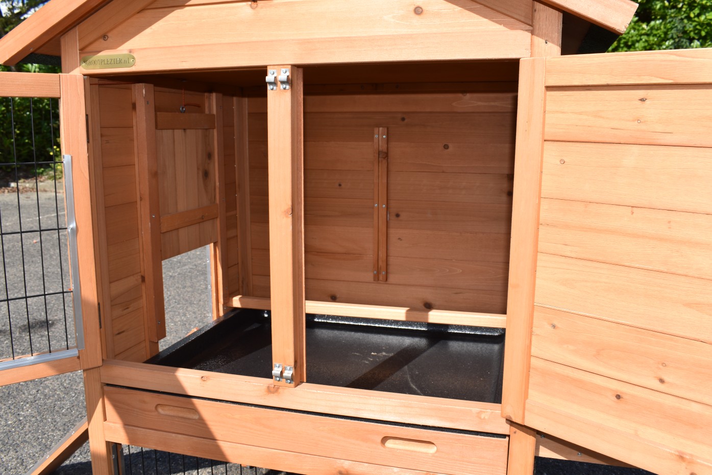Kurnik jest dopracowany w każdym detalu – posiada szerokie drzwiczki, wygodną wysuwaną szufladę oraz część nocną z jedną grzędą.