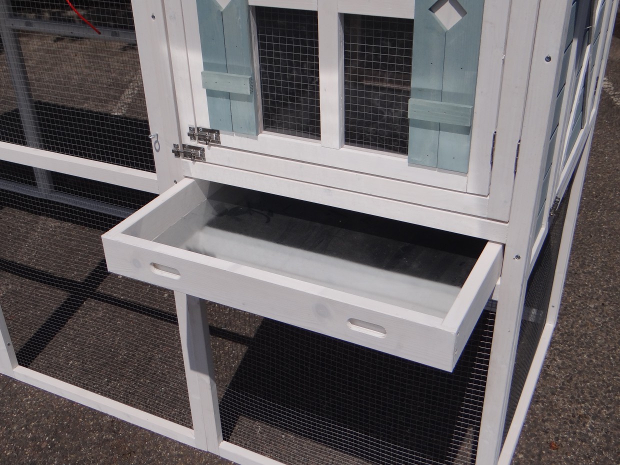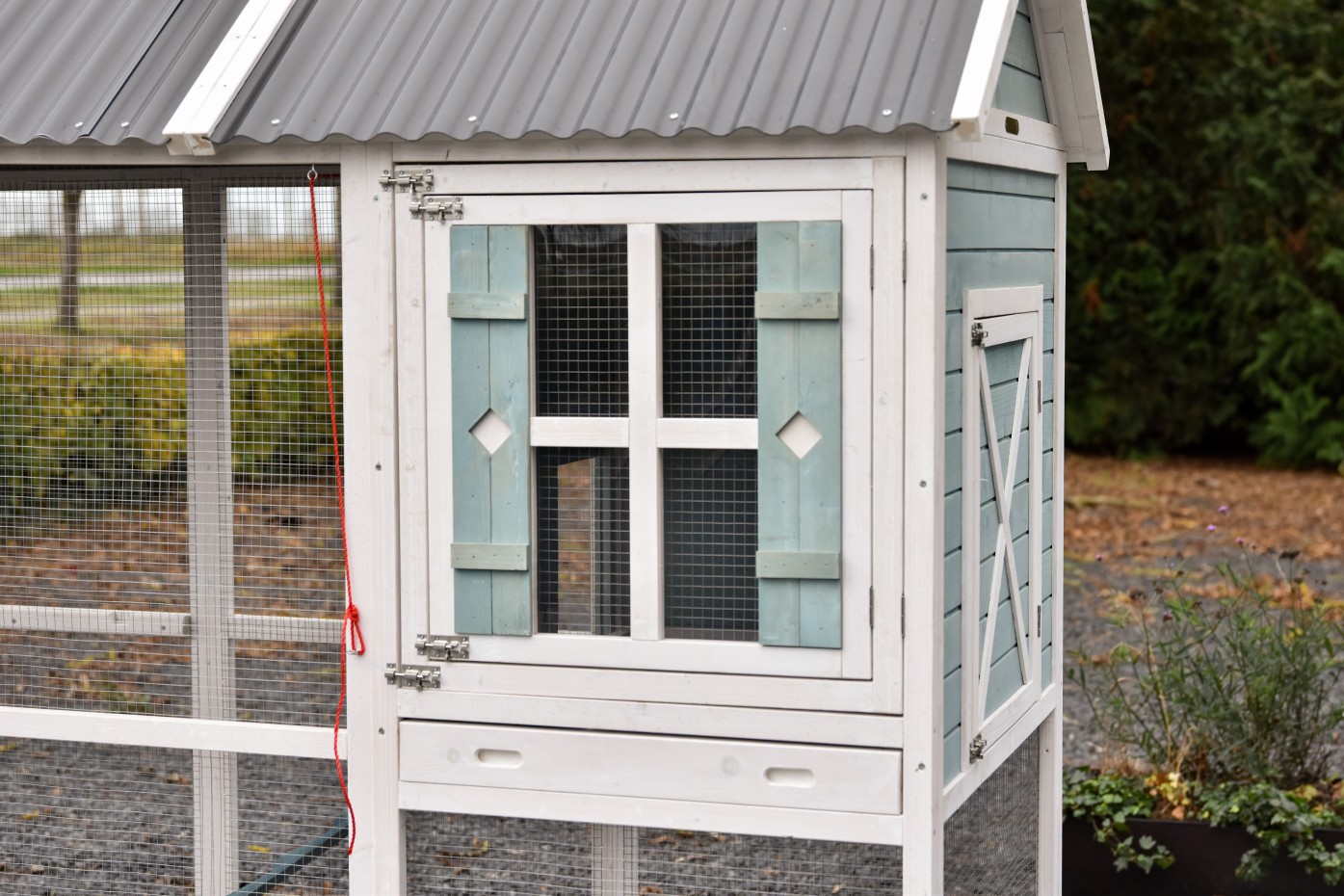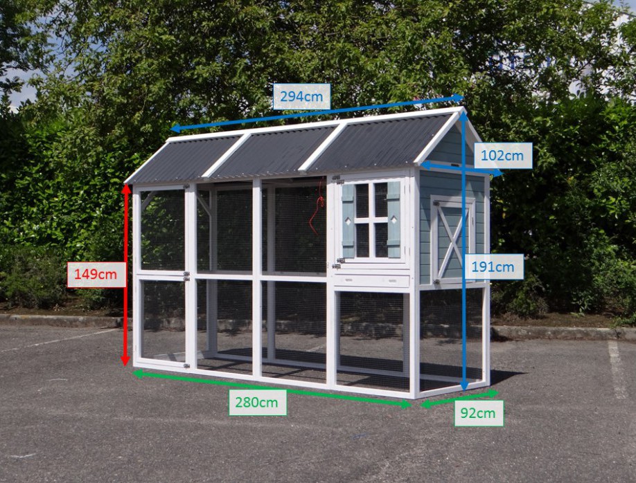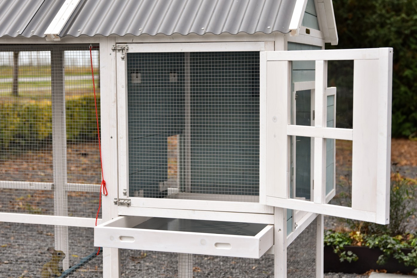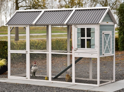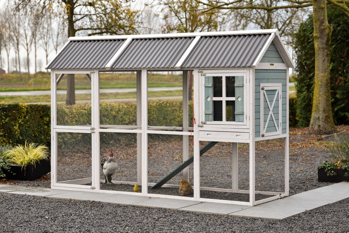 Kurnik Alexia dostarczany jest w atrakcyjnej kolorystyce biało-niebieskiej. Ten duży kurnik ma przestronny wybieg zewnętrzny. Drzwi na krótkim boku wybiegu mają wymiary 79×69 cm. Duże podwójne drzwi z lewej przedniej strony wybiegu mają 62×142 cm (s×w). Wewnątrz wybiegu najwyższy punkt ma około 185 cm! Ten piękny kurnik ma praktyczny, plastikowy dach.