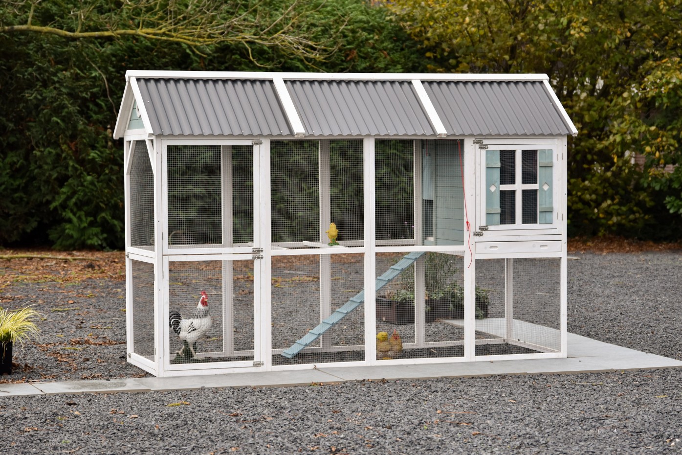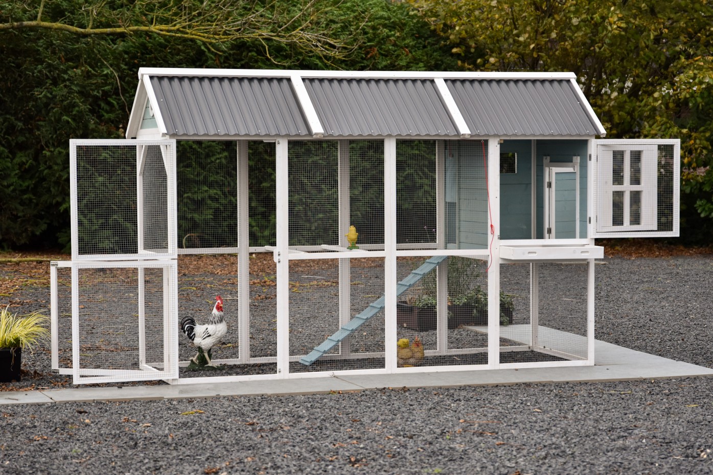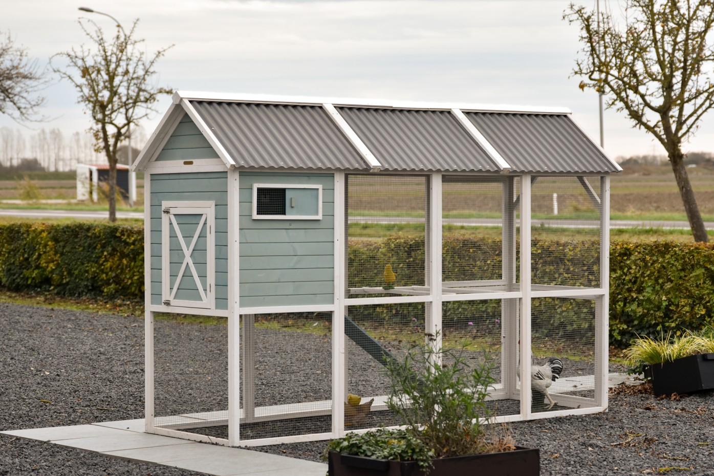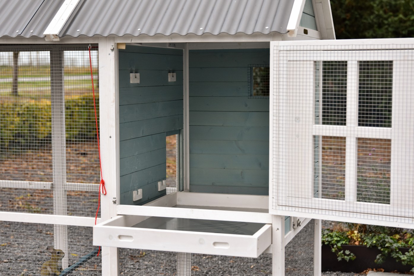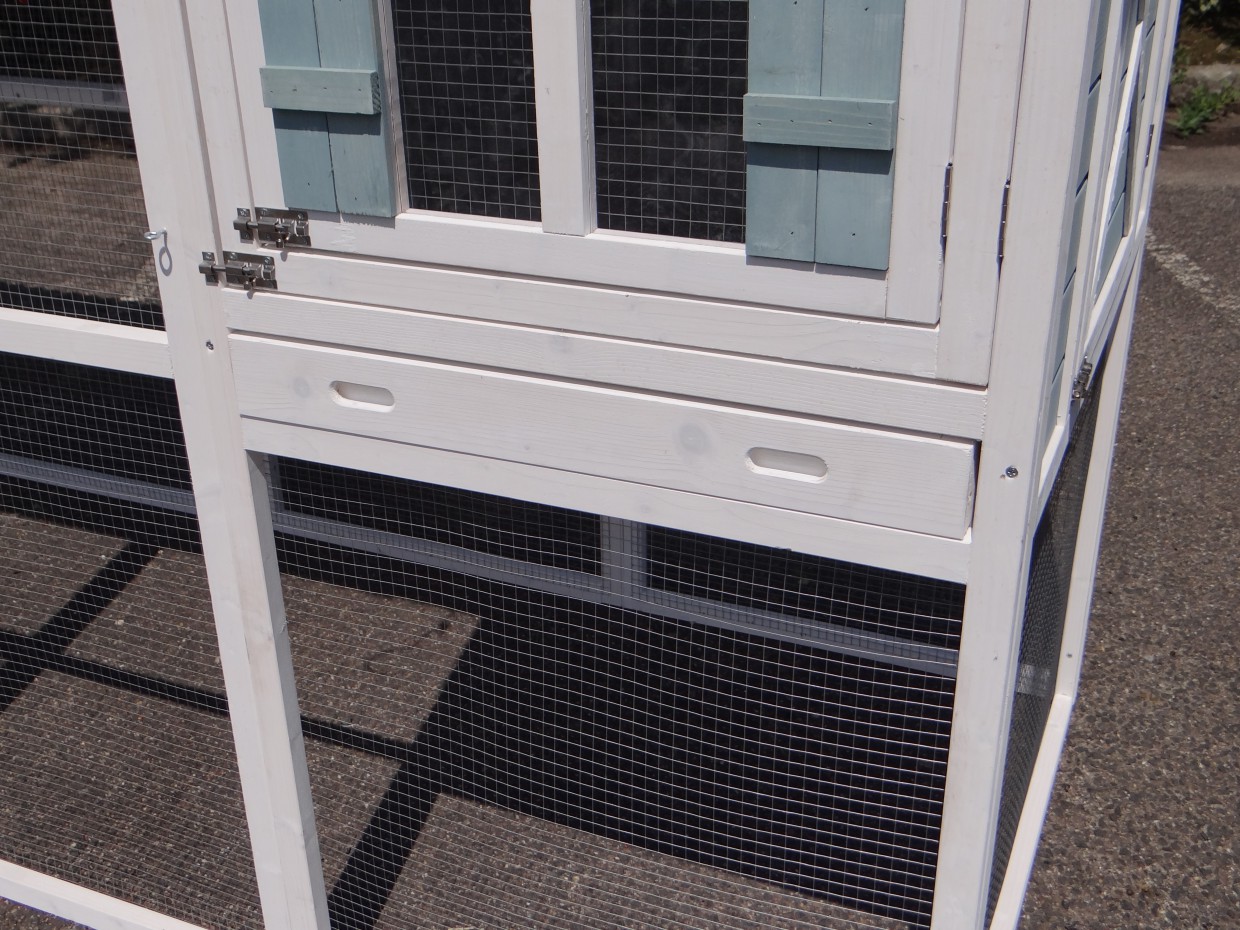 Kurnik Alexia dostarczany jest w atrakcyjnej kolorystyce biało-niebieskiej. Ten duży kurnik ma przestronny wybieg zewnętrzny. Drzwi na krótkim boku wybiegu mają wymiary 79×69 cm. Duże podwójne drzwi z lewej przedniej strony wybiegu mają 62×142 cm (s×w). Wewnątrz wybiegu najwyższy punkt ma około 185 cm! Ten piękny kurnik ma praktyczny, plastikowy dach.