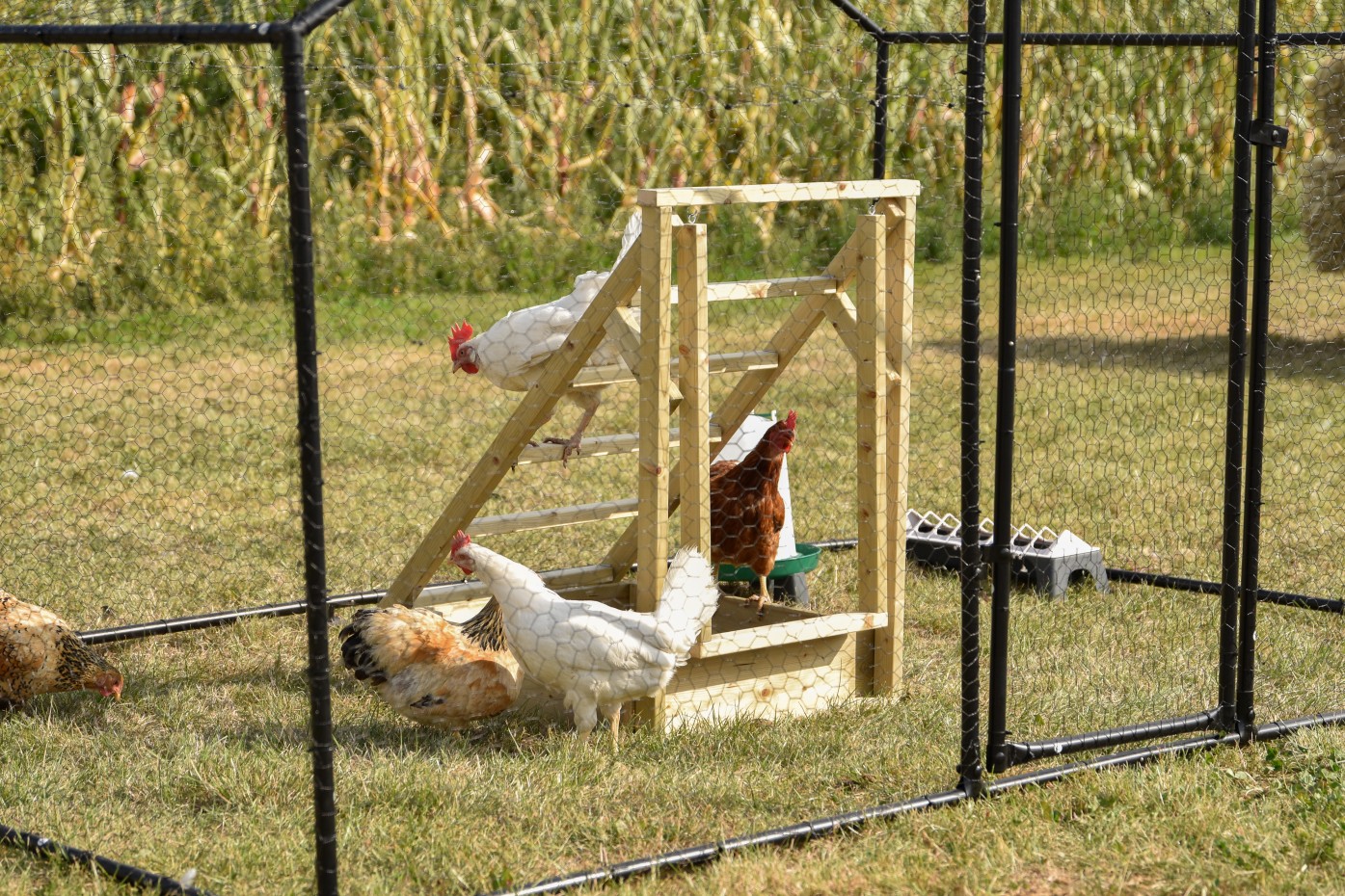 Woliera Grande to przestronny wybieg odpowiedni dla 4–12 kur. Dzięki dużym drzwiom z solidnym zamknięciem można łatwo wejść do środka, a kury pozostają bezpieczne w wybiegu. Stelaż dostarczany jest z siatką, którą można samodzielnie przyciąć na wymiar i przymocować do ramy za pomocą opasek zaciskowych. Wewnątrz woliery jest wystarczająco dużo miejsca na kurnik, karmidło, poidło, a nawet zabawkę zapewniającą kurom dodatkowy ruch. W tej wersji dołączona jest plandeka, dzięki której kury mogą zawsze grzebać na sucho i w osłonie – zarówno podczas deszczu, jak i w słoneczne dni. Woliera Grande z plandeką oferuje idealne połączenie przestrzeni, bezpieczeństwa i komfortu.