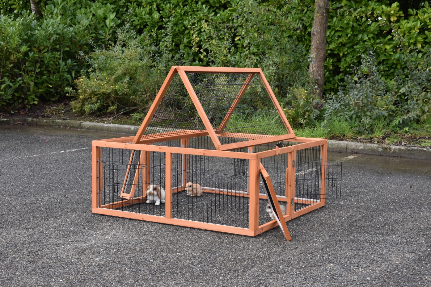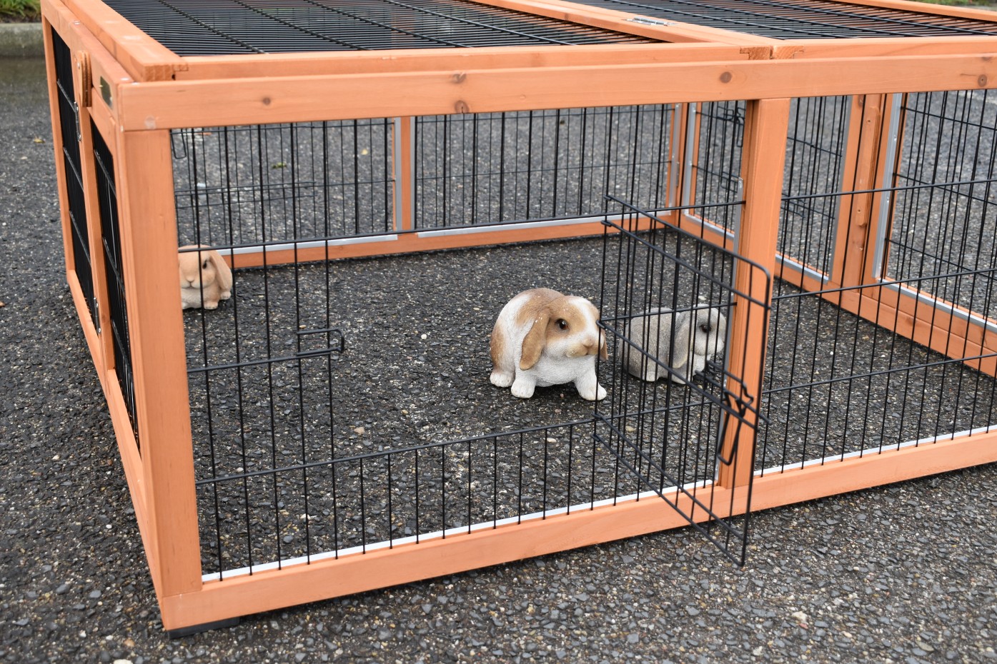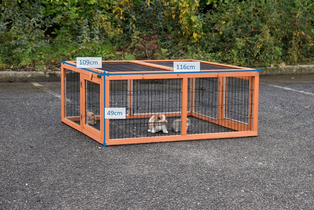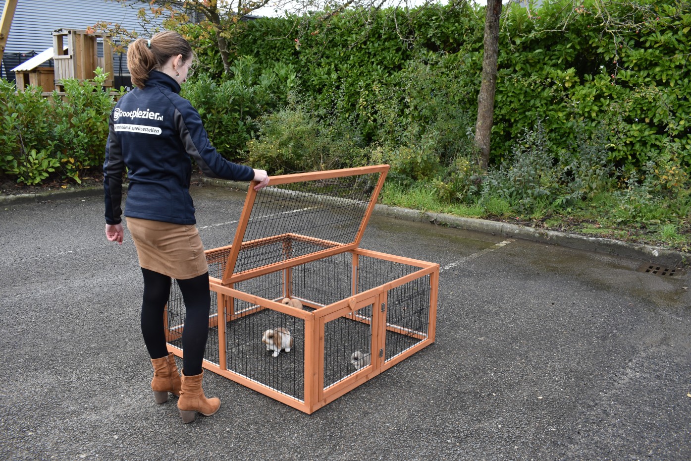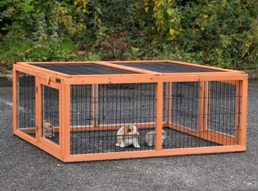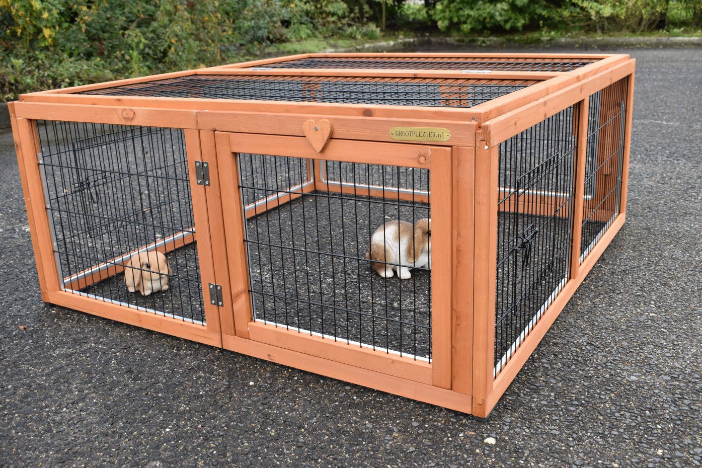 Woliera dla królików Multirun jest wyposażona w aluminium na większości krawędzi w woliery, aby zapobiec gryzieniu. Wolaiera dla królików jest w pełni składana i łatwo można ją podłączyć do różnych klatek dla królików. Może także być ustawiona oddzielnie od klatki dla królików. Ta praktyczna wolaiera ma 3 drzwi w kratce po 3 stronach i 2 strony mają demontowalne panele. Pozwala to na łączenie kilku woliery. Górna część woliery dla królików jest również łatwo składana i demontowalna. Wolaiera wielofunkcyjna!