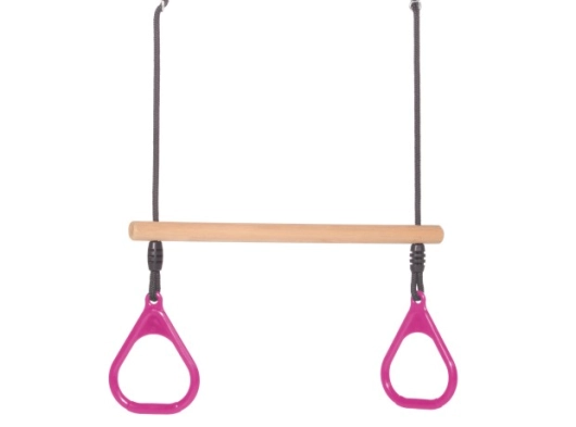 Drewniana trapez na pierścieniach jest wyposażona w plastikowe pierścienie w kolorze rozowy. Wykonuj różne sztuczki na pierścieniach i trapezie. Trapez na pierścieniach zapewnia wiele radości z zabawy!