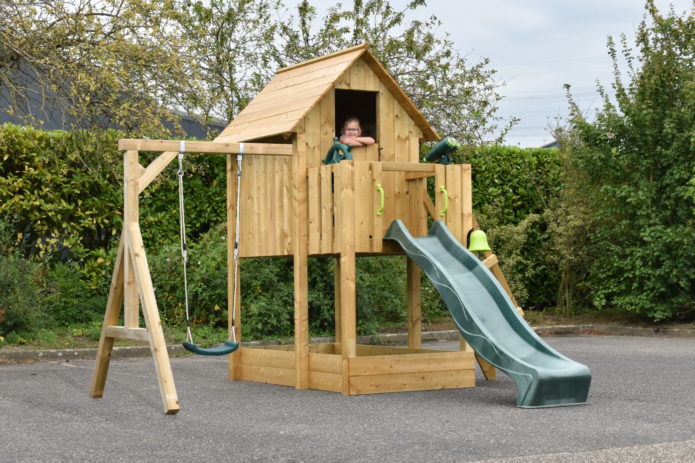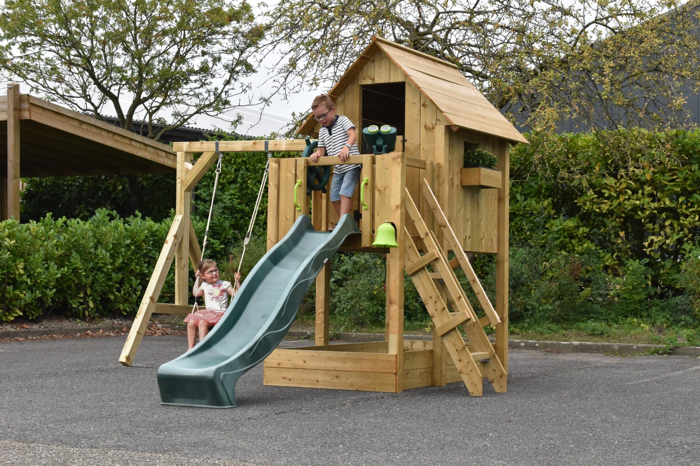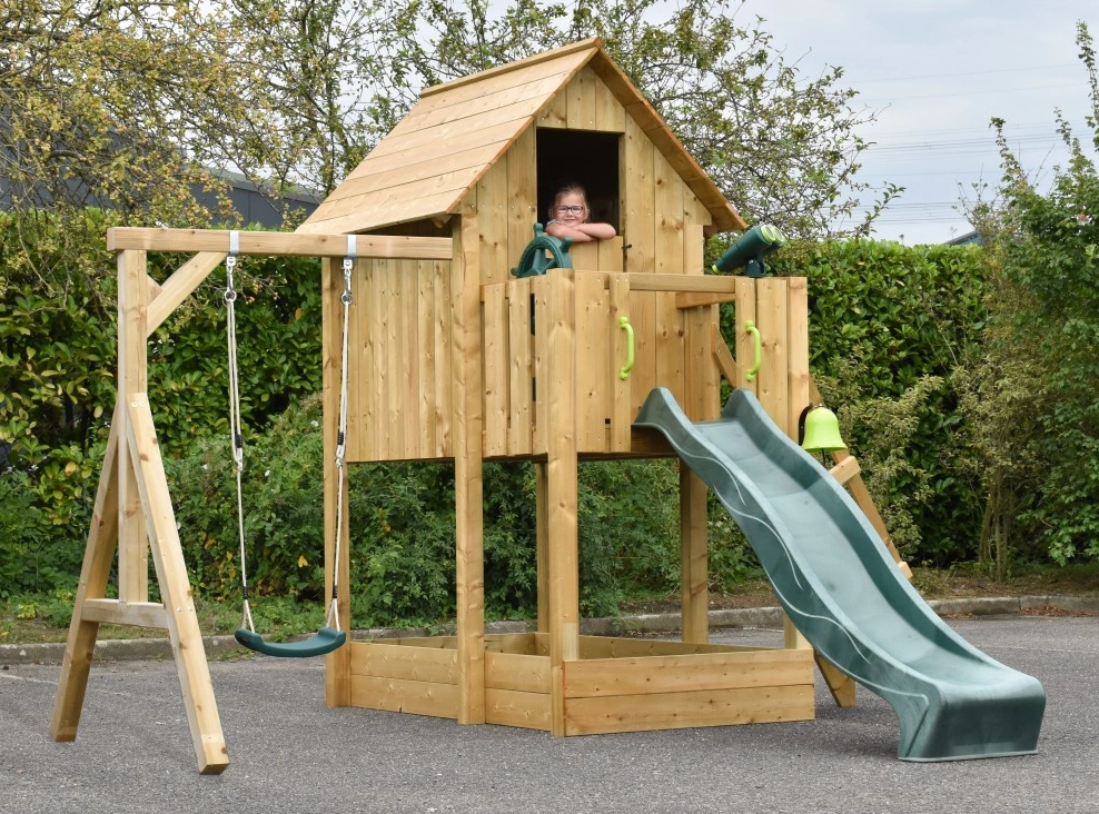 Domek zabaw Dream 120 to marzenie wszystkich dzieci, które lubią bawić się na świeżym powietrzu. Ten zamknięty domek ma platformę na wysokości 120 cm, dzięki czemu można siedzieć wysoko i sucho. Domek Dream posiada długą zjeżdżalnię o długości 230 cm. Dodatkowo domek wyposażony jest w pojedynczą huśtawkę, odpowiednią dla jednego siedziska lub jednej huśtawki-gniazda. Przyjazna dla dzieci drabinka ma płaskie stopnie oraz poręcz. Na dole konstrukcji znajduje się duża przestrzeń na piaskownicę lub do przechowywania luźnych zabawek.