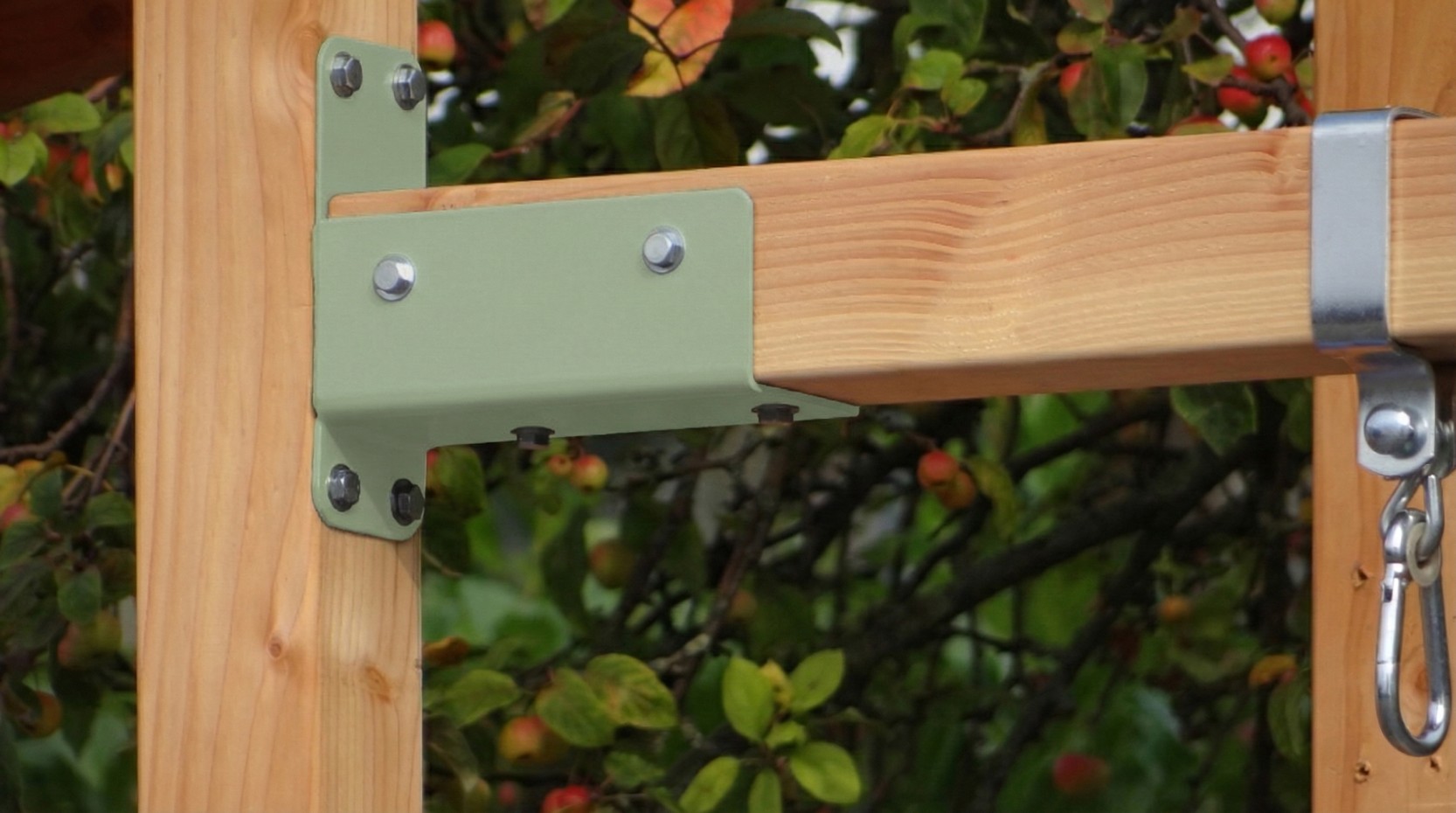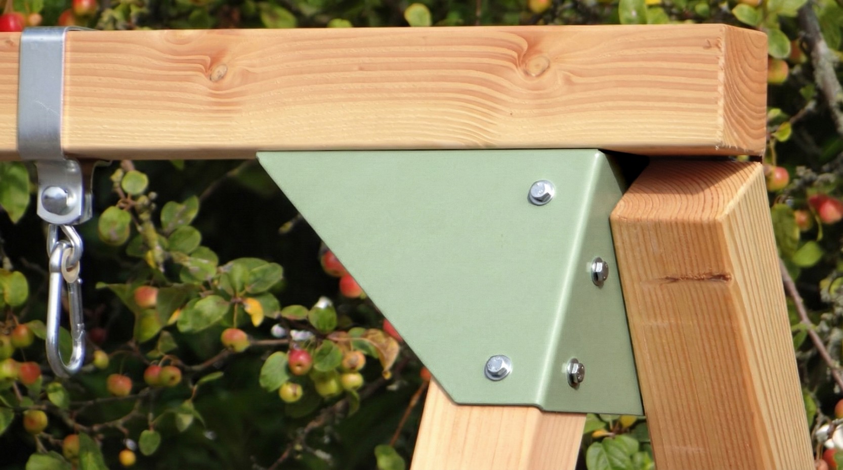 Huśtawka Succes to uniwersalna rama do montażu. To najładniejszy i najkorzystniejszy model na rynku. W zestawie haki, kotwy gruntowe i 3 solidne słupy z daglezji, wzmocnione 18 mm deską dla dodatkowej stabilności. Siedziska dostępne osobno. Huśtawka jest wyposażona w pastelowozielone narożniki.