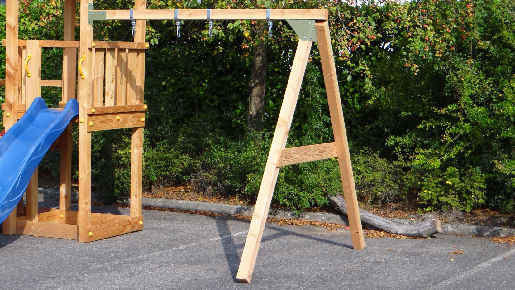 - Kąt między nogami a belką jest prosty, dzięki czemu huśtawka zajmuje mało miejsca, a jednocześnie jest stabilna.